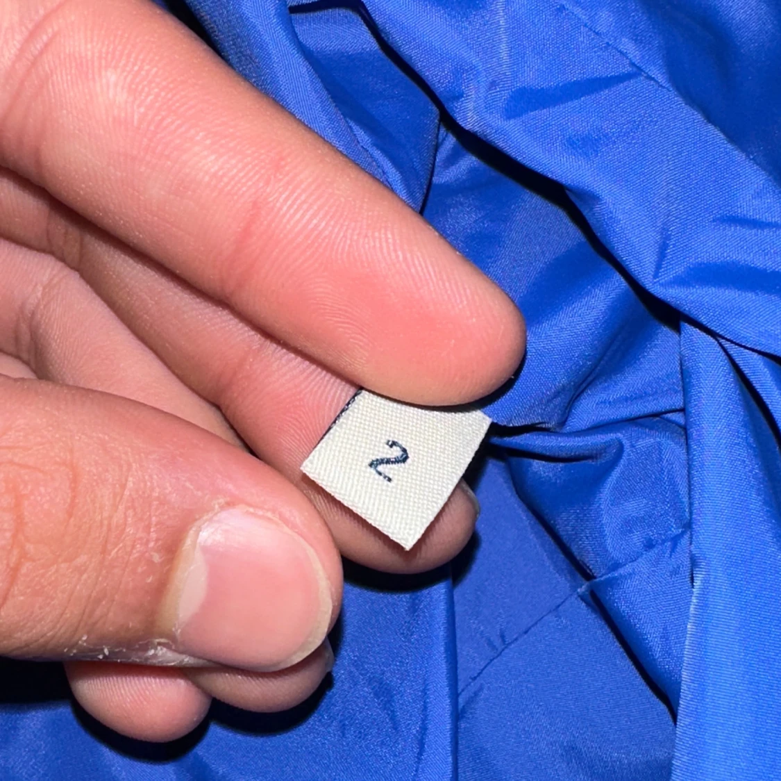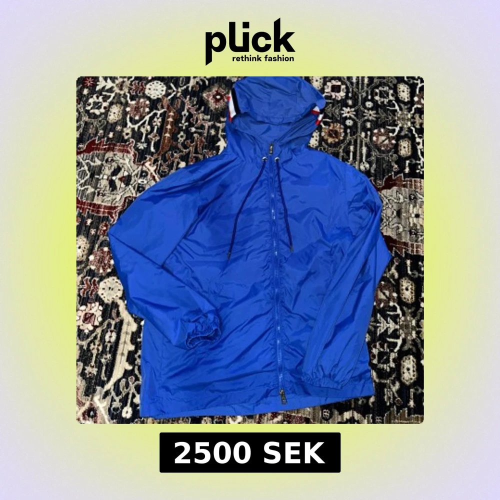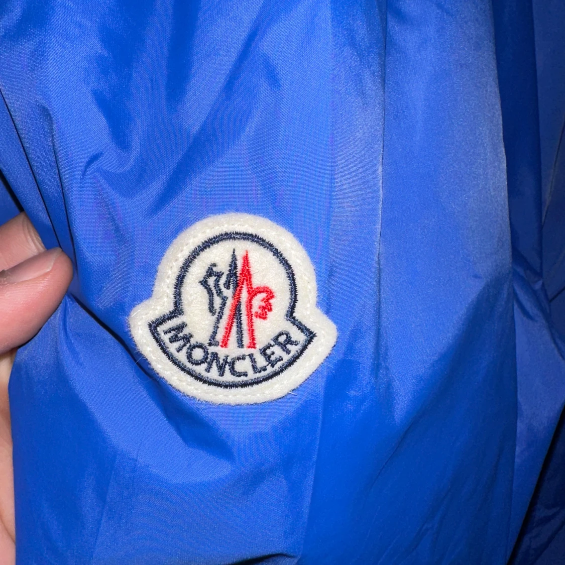 Blå vindjacka från Moncler med huva och dragsko, hel dragkedja framtill och elastiska muddar. Snygg detalj med rödvit rand på huvan och klassisk Moncler-logga på ärmen. Perfekt för dig som vill ha en stilren och sportig look. Tar även emot byten