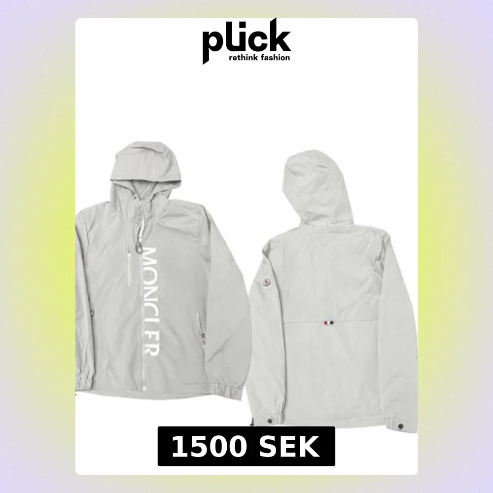 Snygg vit vindjacka från Moncler med huva och dragkedja framtill. Jackan har stora Moncler-trycket längs ena sidan och två fickor med dragkedja. Elastiska muddar vid ärmslut och nederkant ger en skön passform. Perfekt för blåsiga dagar. Size är M
