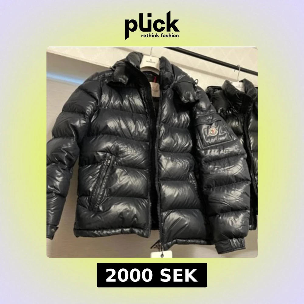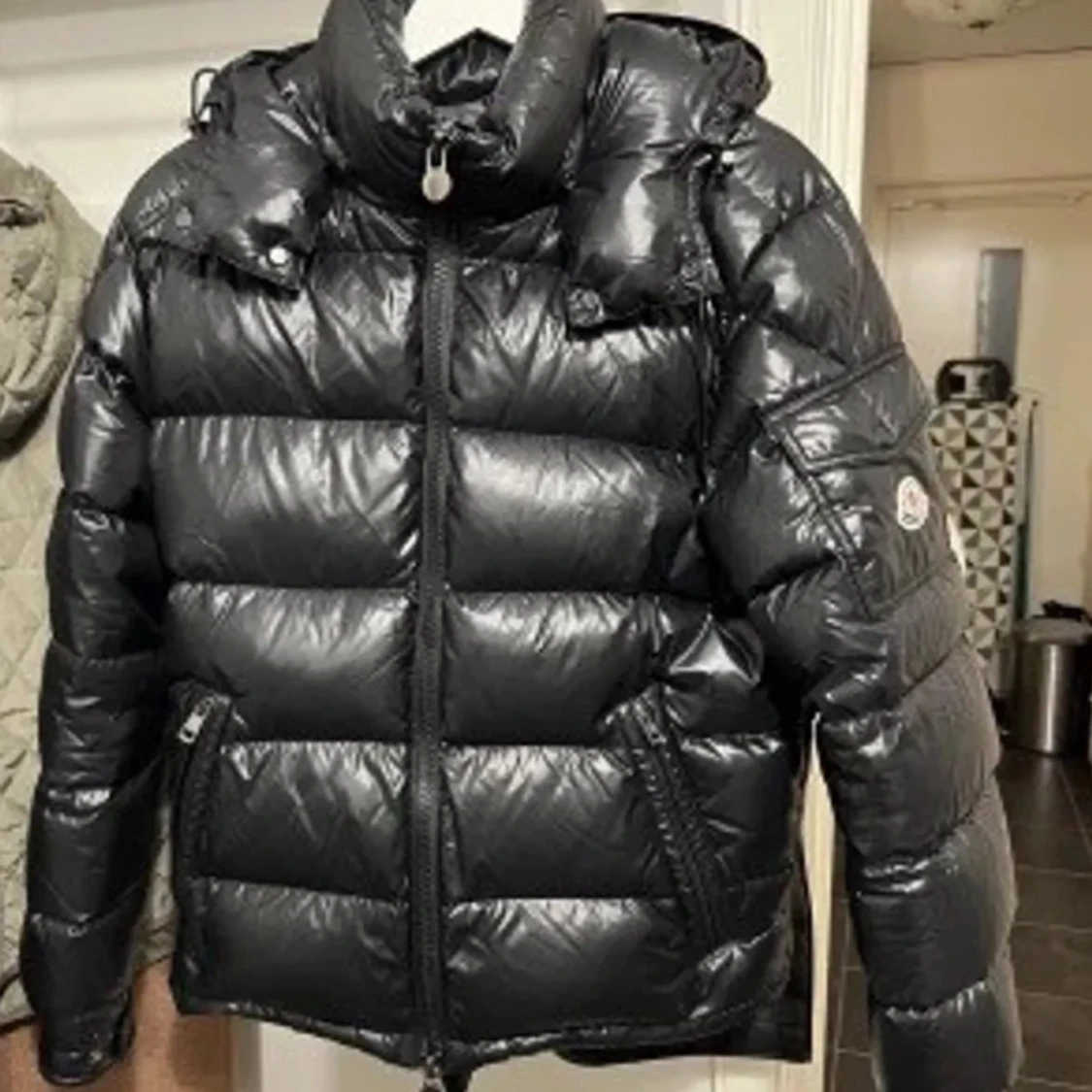 Säljer en svart pufferjacka från Moncler med glansig finish och klassisk logga på ärmen. Jackan har hög krage, två sidofickor med dragkedja och quiltad design. Perfekt för kalla dagar och har en riktigt snygg streetstil. Passar dig som vill ha en varm och trendig jacka.