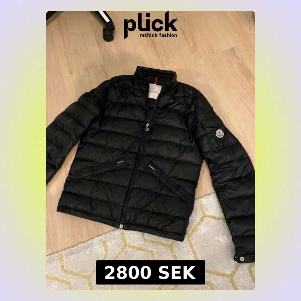 Säljer en svart pufferjacka från Moncler med klassisk logga på ärmen. Jackan har dragkedja framtill, två snedställda fickor med dragkedja och en liten ficka på ärmen. Lättviktigt material och quiltad design gör den perfekt för kyliga dagar.