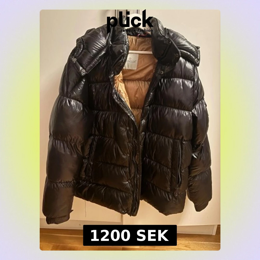 Säljer en svart pufferjacka från Moncler med glansig finish och beige/guld foder. Perfekt skick. Sparsamt använd. Storlek 4. Jackan har huva, dragkedja och tryckknappar framtill. Mycket varm, perfekt för kalla dagar och har en riktigt schysst oversized vibe.