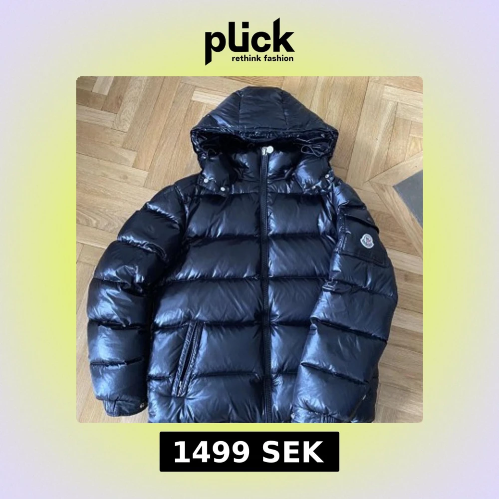 Svart Moncler dunjacka med huva - Säljer en svart Moncler dunjacka med glansig finish och huva. Jackan har Moncler-logga på ärmen, dragkedja framtill och quiltad design. Fylld med gåsdun för extra värme. Perfekt för dig som vill ha en snygg och lyxig vinterjacka.