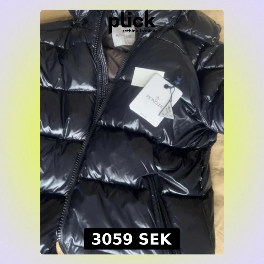 Snygg svart dunjacka från Moncler med glansig finish och klassisk quiltad design. Jackan har dragkedja framtill, hög krage och en ikonisk Moncler-logga på insidan. Perfekt för kalla dagar och riktigt trendig look. Storlek 5