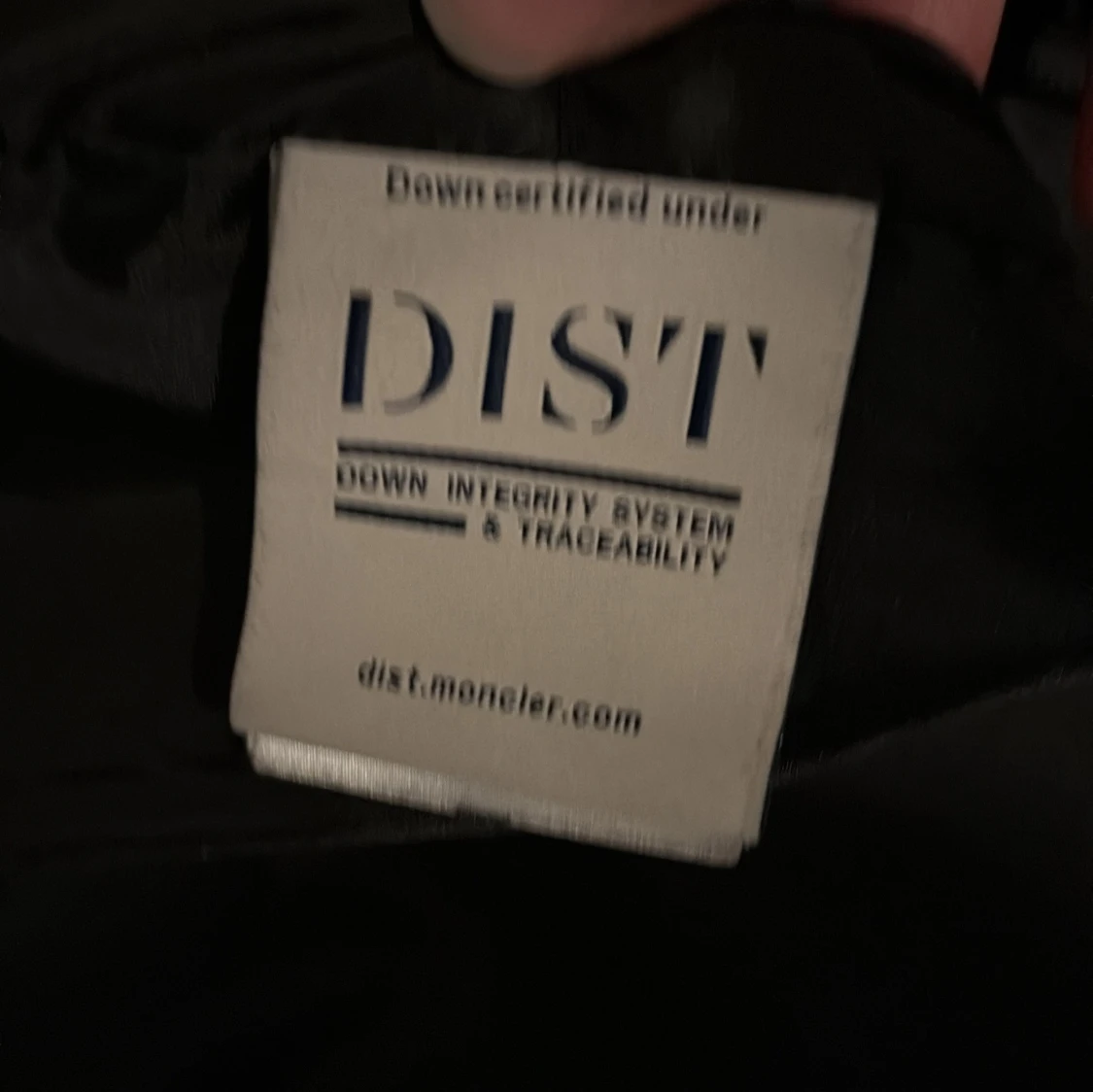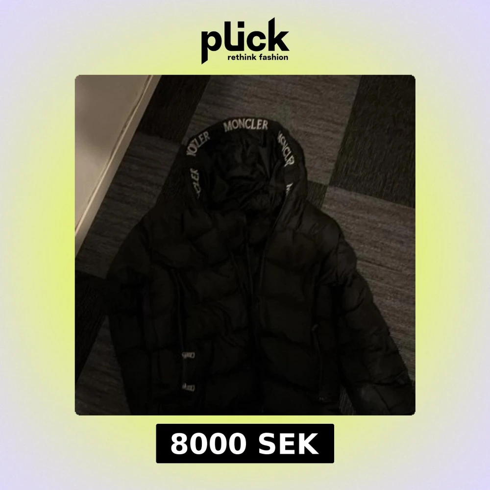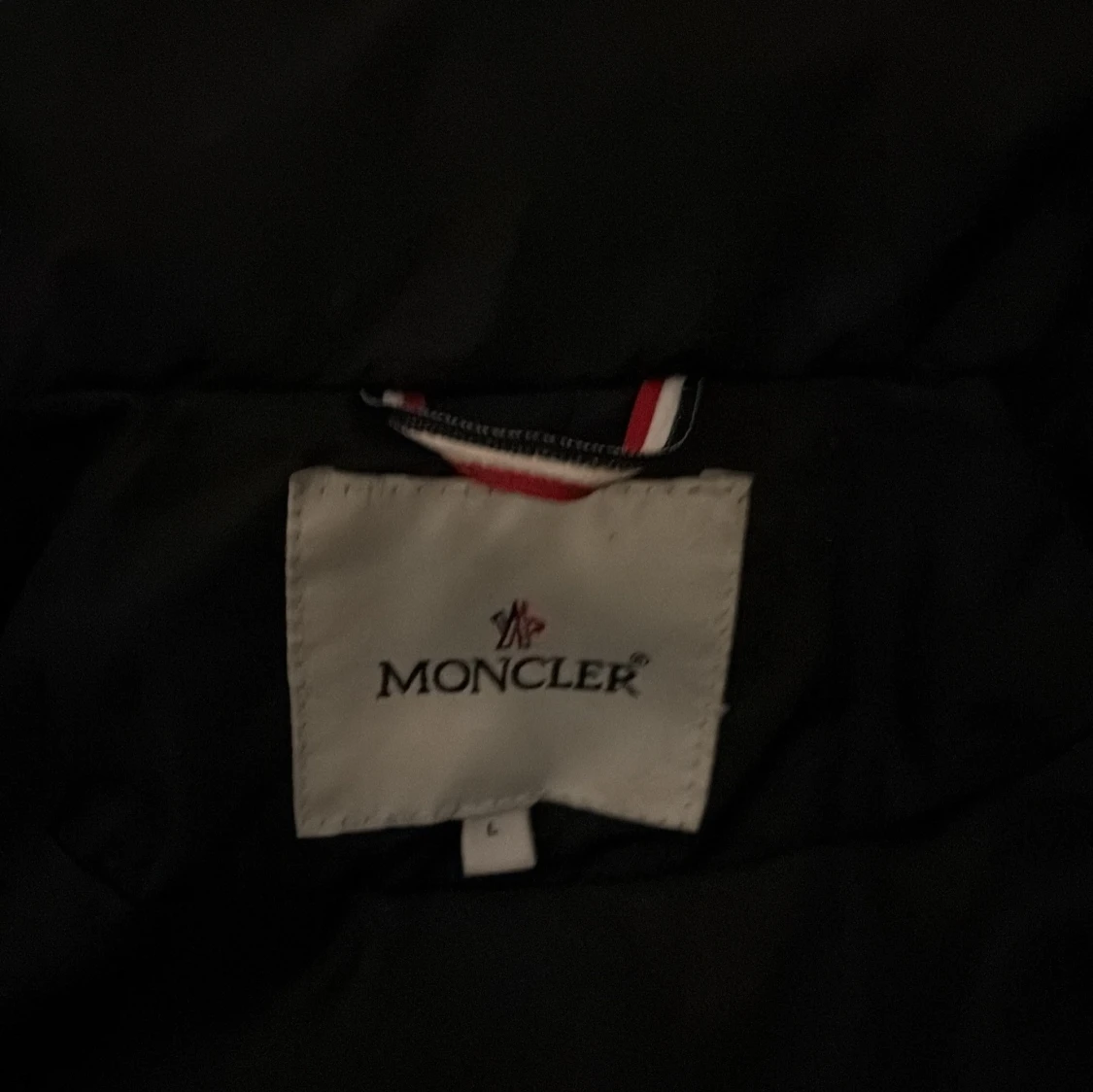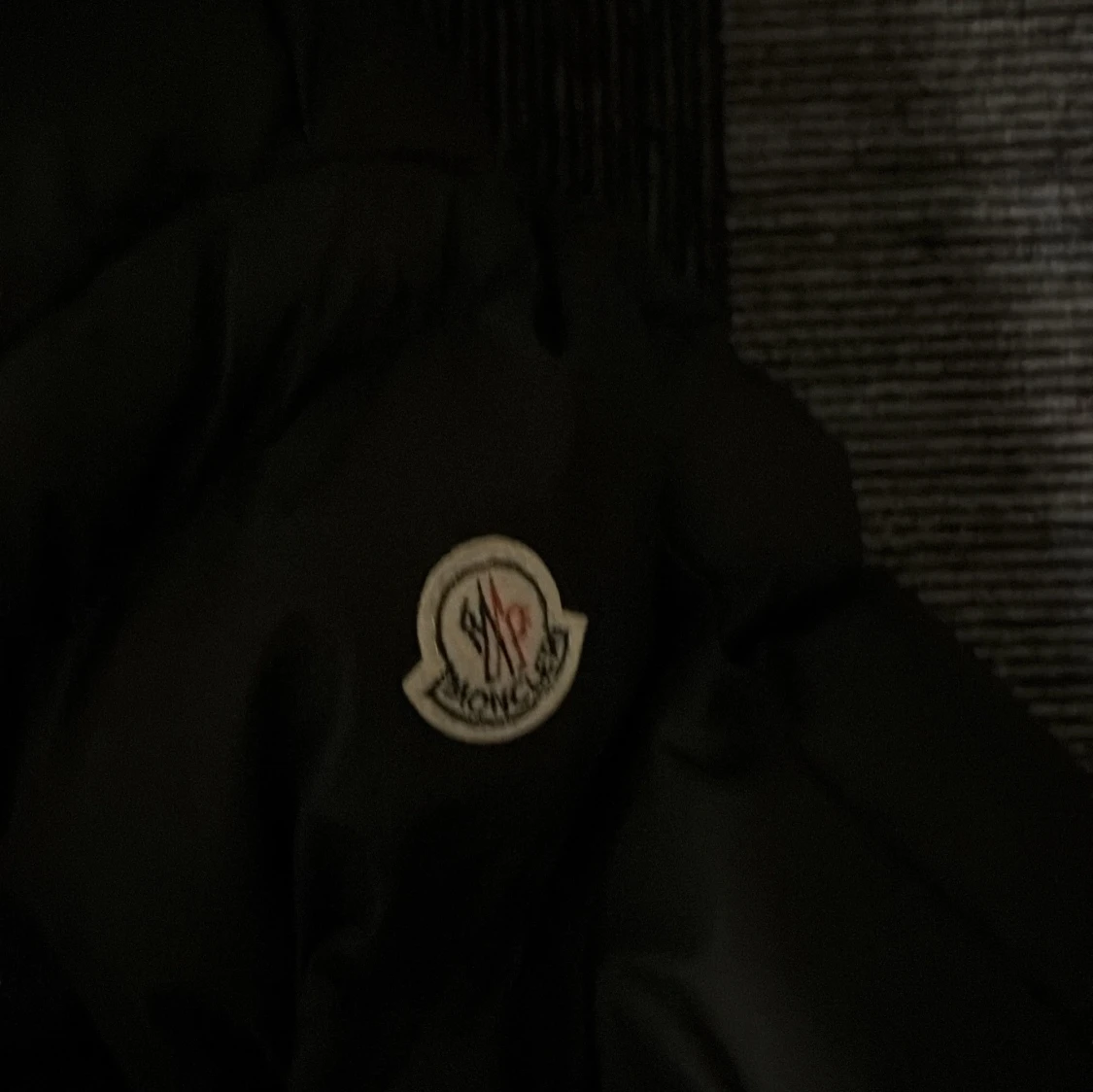 Säljer en svart dunjacka från Moncler med stor huva och tydlig logga på ärmen. Jackan har dragkedja framtill och coola detaljer med Moncler-tryck på huvkanten. Perfekt för kalla dagar när du vill hålla stilen.