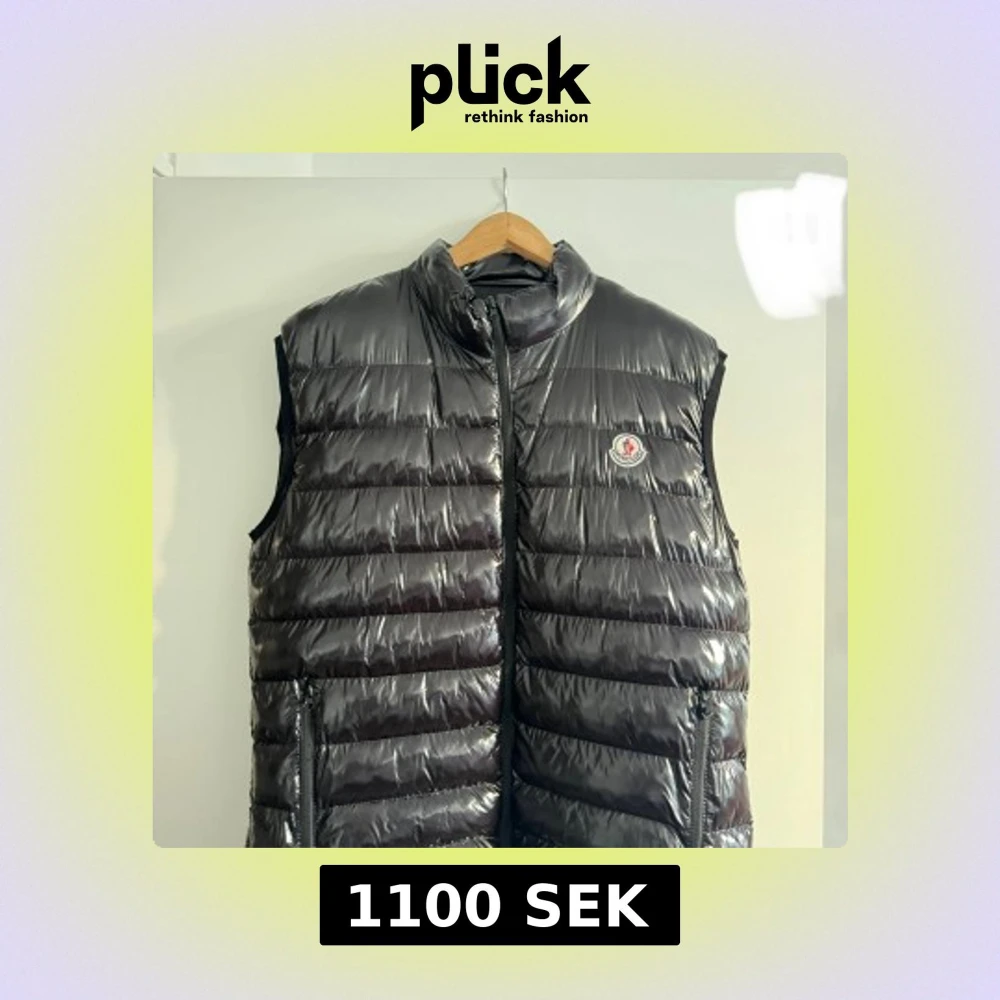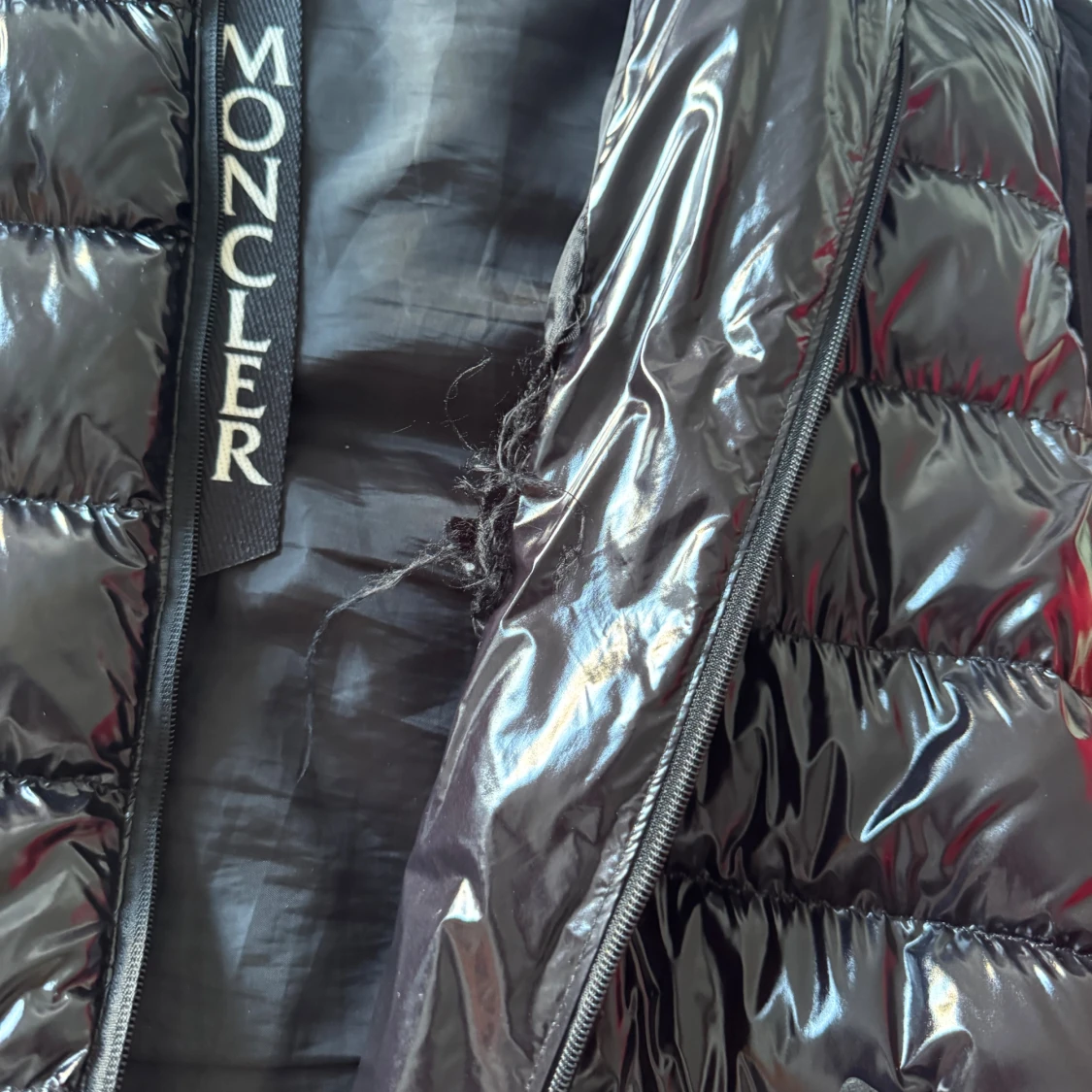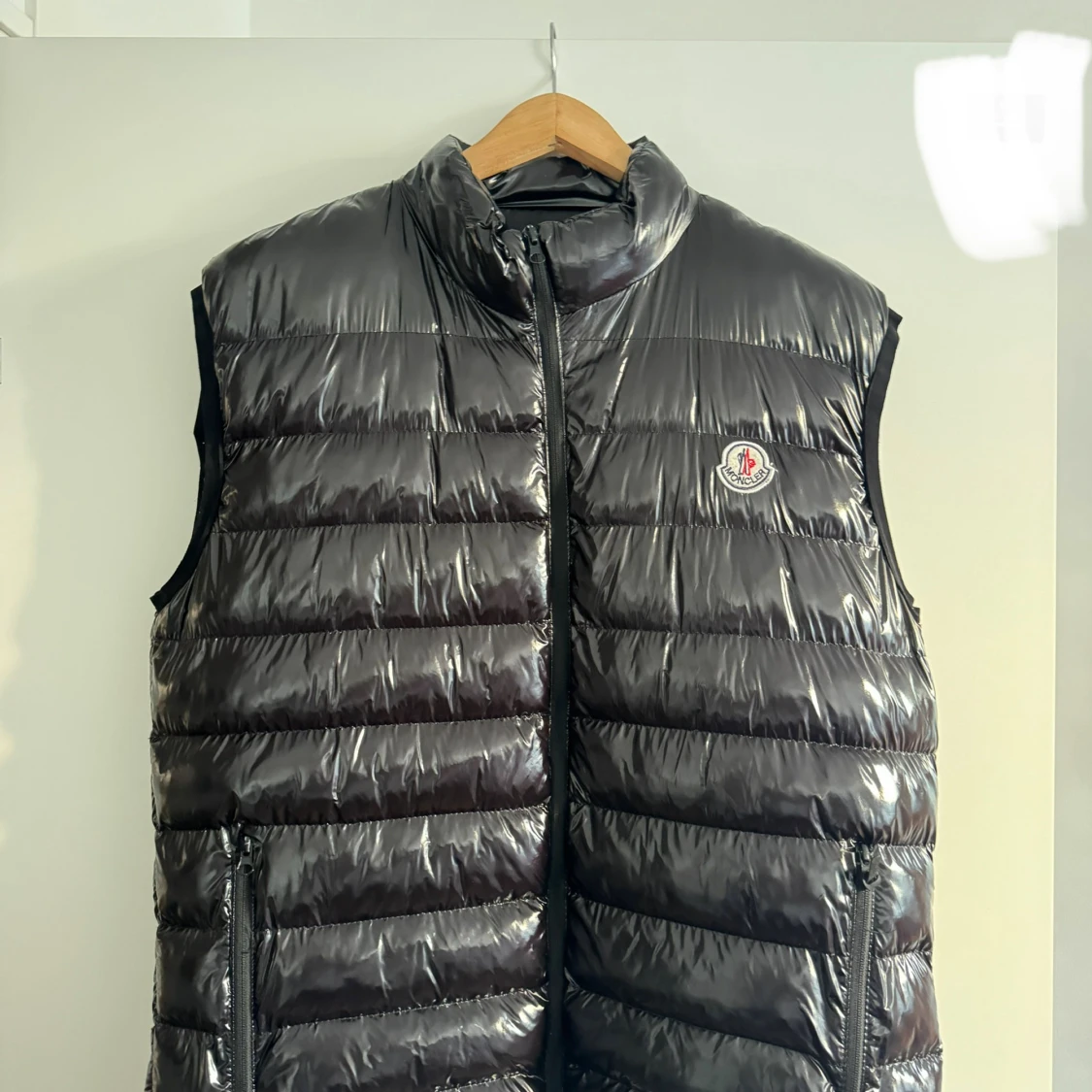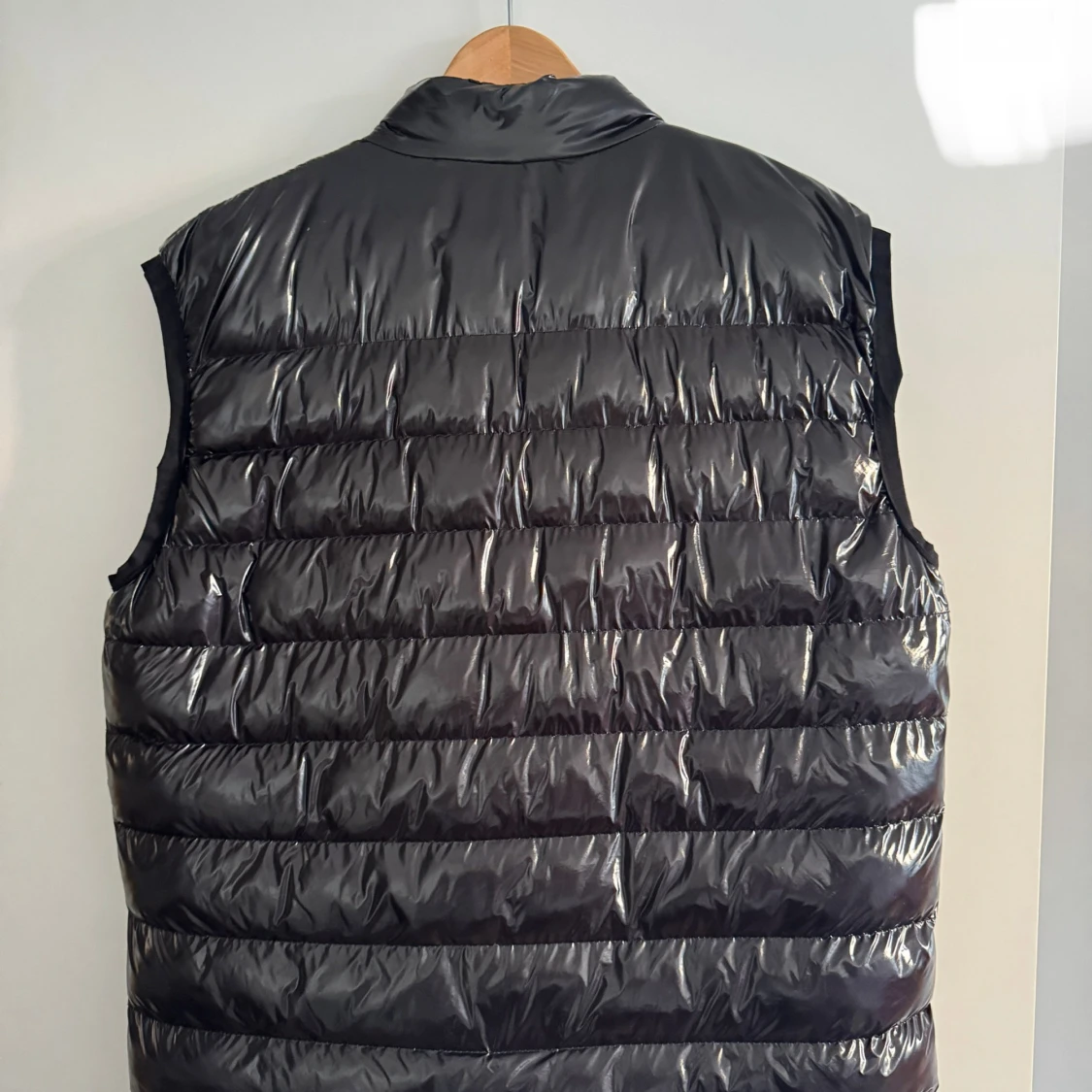 Snygg svart dunväst från Moncler med glansig finish och horisontella quiltade paneler. Västen har hög krage, dragkedja framtill och två fickor med dragkedja. Moncler-logga på bröstet ger en exklusiv vibe. Perfekt för lager-på-lager under kyliga dagar.