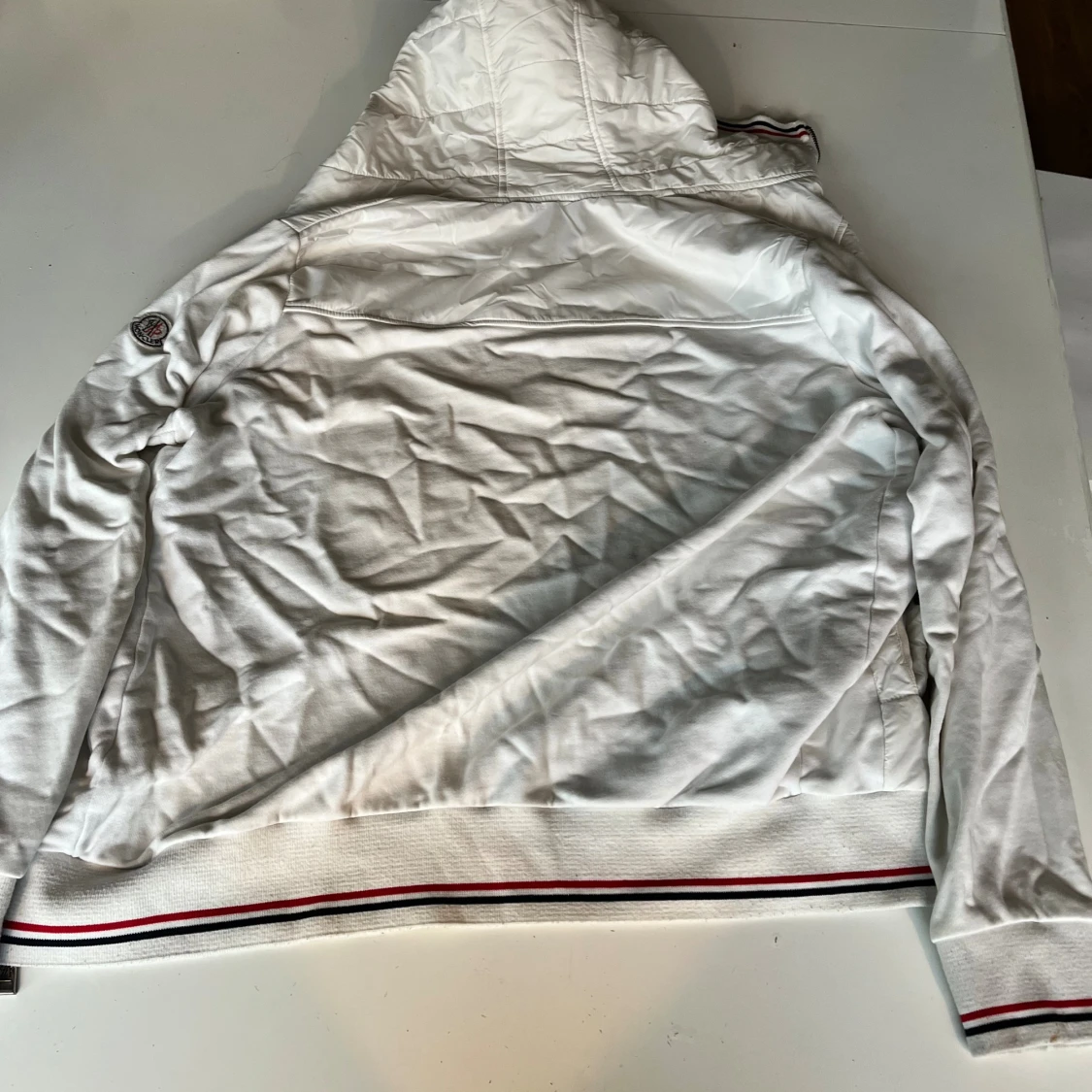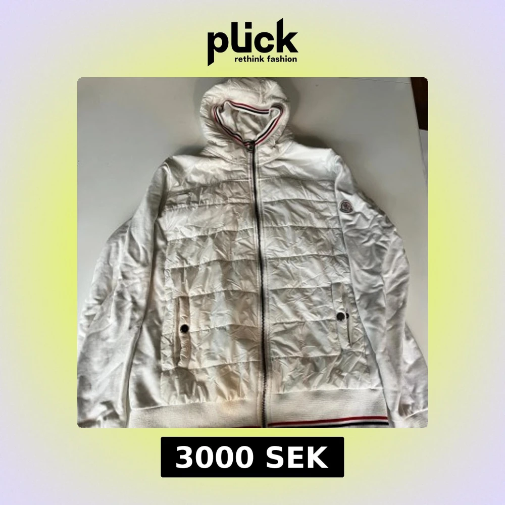 Snygg vit pufferjacka från Moncler med quiltad framsida, huva och dragkedja. Jackan har ribbade muddar och nederkant med röd, vit och blå rand. Moncler-logga på ärmen och praktiska fickor framtill. Perfekt för dig som gillar stilren och sportig look. PRIS KAN DISKUTERAS VID SNABB AFFÄR.