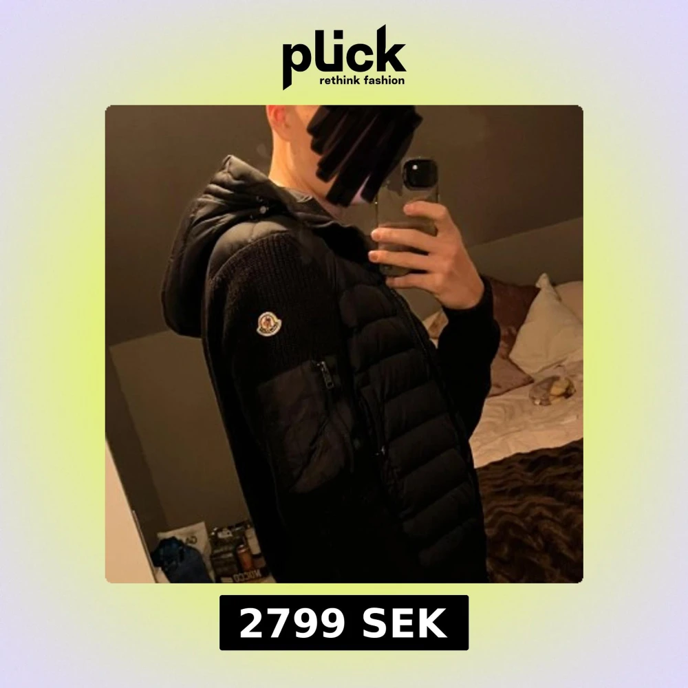 Säljer en svart pufferjacka från Moncler med stickade ärmar och huva. Jackan har dragkedja framtill, ribbade muddar och en liten ficka med dragkedja på ärmen. Klassisk Moncler-logga på armen och quiltad front. Perfekt för kyliga dagar.