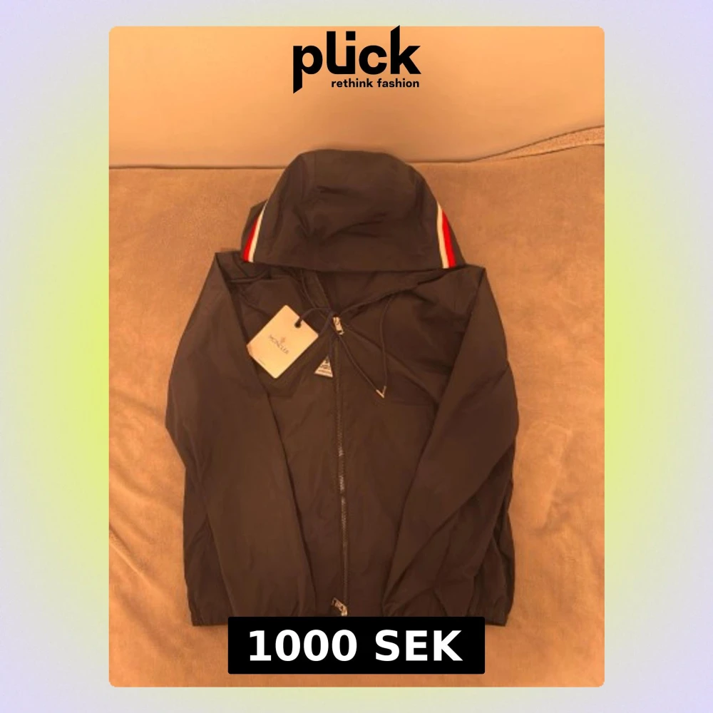 Säljer en svart vindjacka från Moncler med huva och dragkedja. Jackan har Moncler-logga på ärmen och snygga rödvita detaljer på huvan. Tillverkad i lätt polyester som passar perfekt när det blåser. Klassisk och stilren design med elastiska muddar. M MEN PASSAR S. PRIS KAN DISKUTERAS