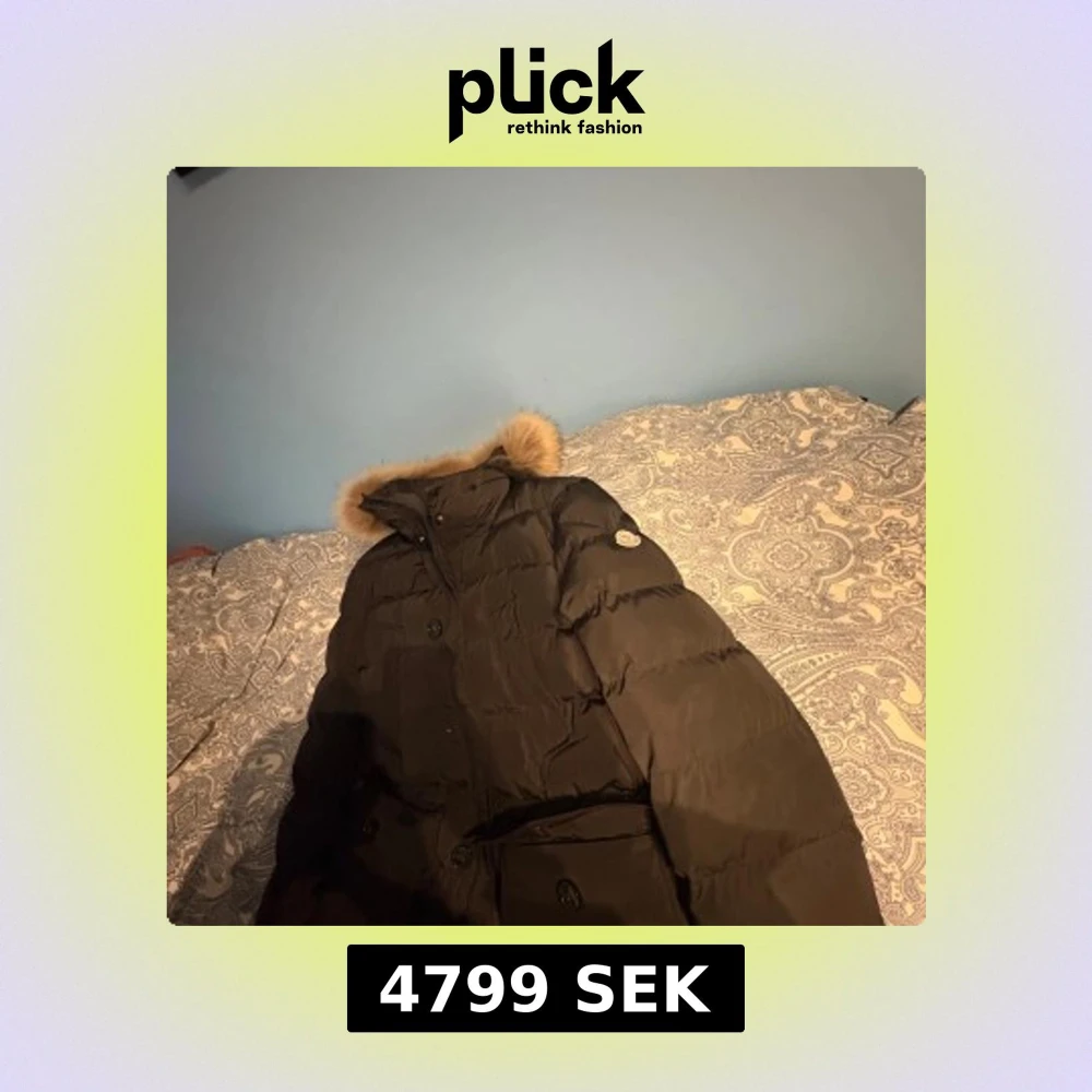 Svart dunjacka från Moncler med fluffig päls på huvan och klassisk logga på ärmen. Jackan har stora knappar framtill, praktiska fickor och ett coolt serietryck på insidan. Perfekt för kalla dagar och har en riktigt schysst puffer-look. ett litet hål finns på insidan och en knapp sönder Storlek M men passar L också pris kan diskuteras vid snabb affär