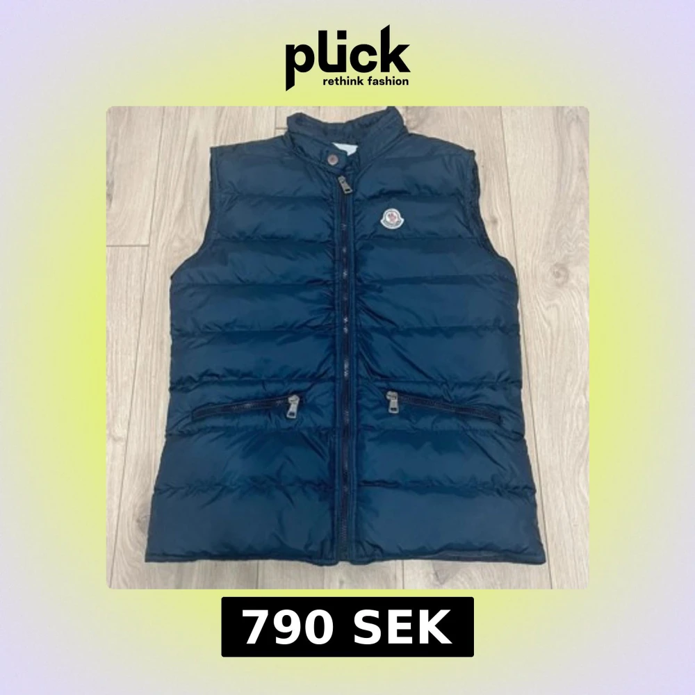 Snygg mörkblå dunväst från Moncler med hög krage och två dragkedjefickor framtill. Västen har quiltad design och klassisk Moncler-logga på bröstet. Perfekt för lager-på-lager och stilren look.