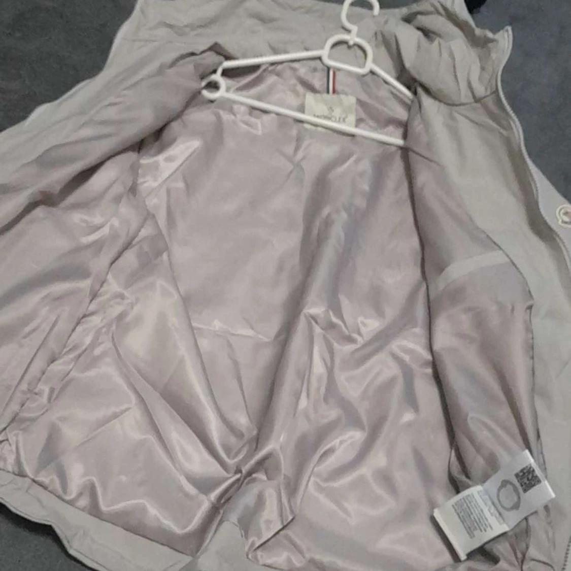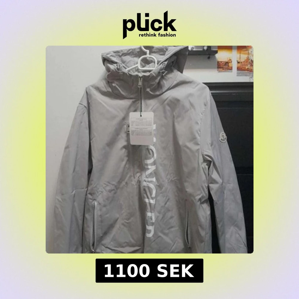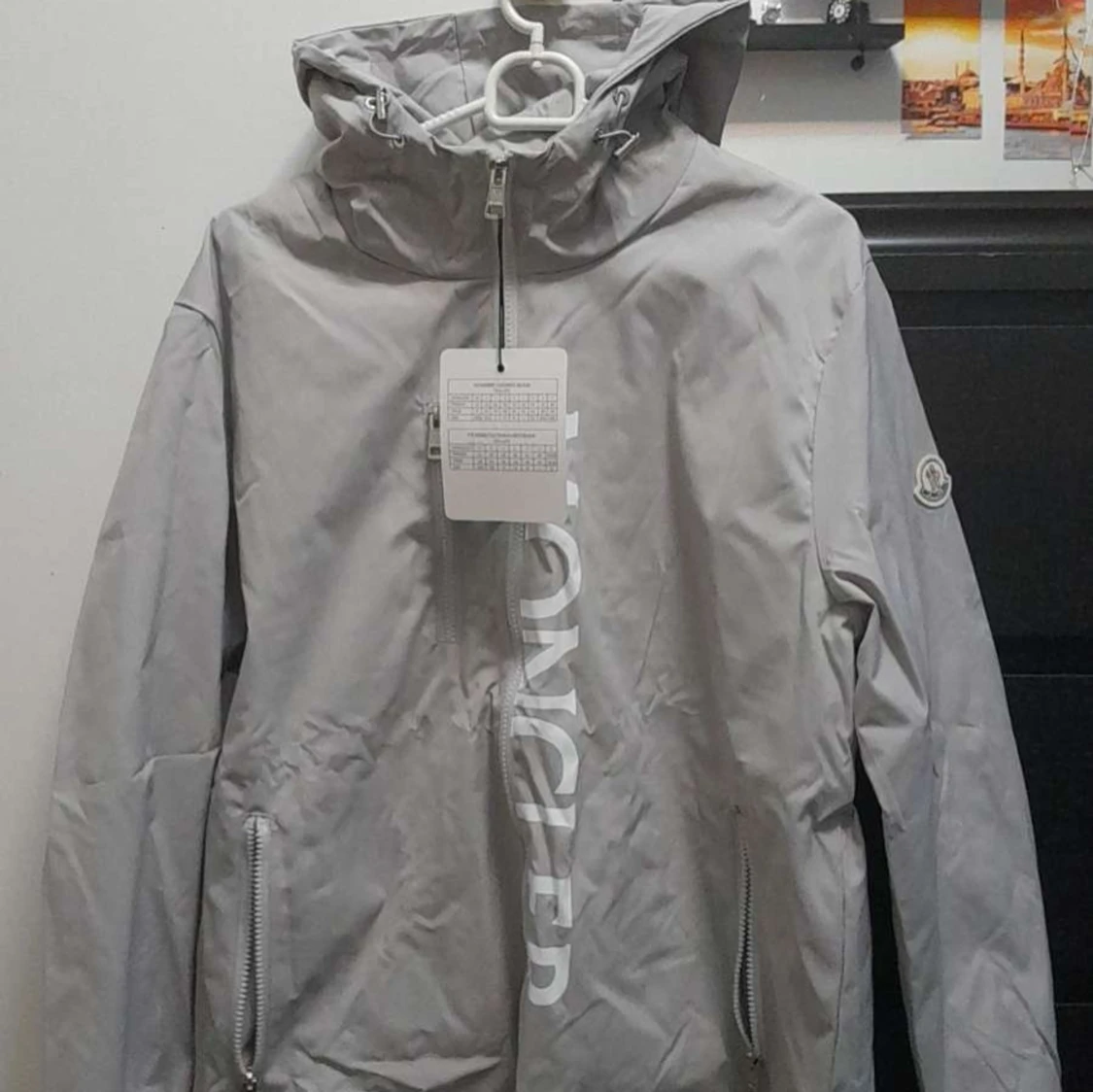 Snygg grå vindjacka från Moncler med huva och dragkedja framtill. Jackan har Moncler-logga på ärmen och stor vit Moncler-text längs framsidan. Fickor med dragkedja och justerbar huva med snörning. Perfekt för dig som gillar stilren och sportig look.