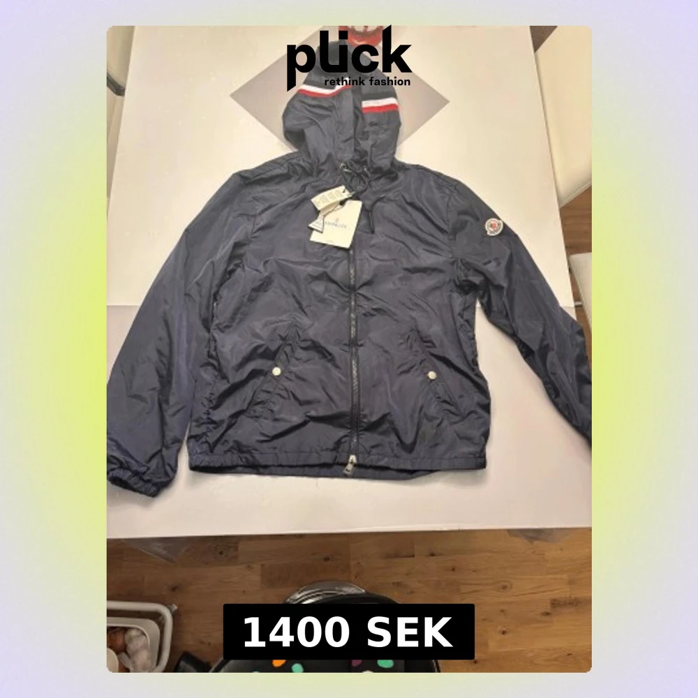 Snygg mörkblå vindjacka från Moncler med huva och coola rödvita detaljer på toppen. Jackan har dragkedja framtill, två fickor med tryckknappar och Moncler-logga på ärmen. Materialet är lätt polyester, perfekt för blåsiga dagar.