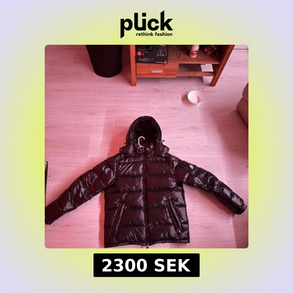 Säljer en svart, glansig pufferjacka från Moncler med huva och dragkedja. Jackan har två snedställda fickor framtill och en ärmficka med Moncler-logga. Insidan har det klassiska Moncler-serietrycket. Perfekt för kalla dagar och riktigt snygg streetstil.