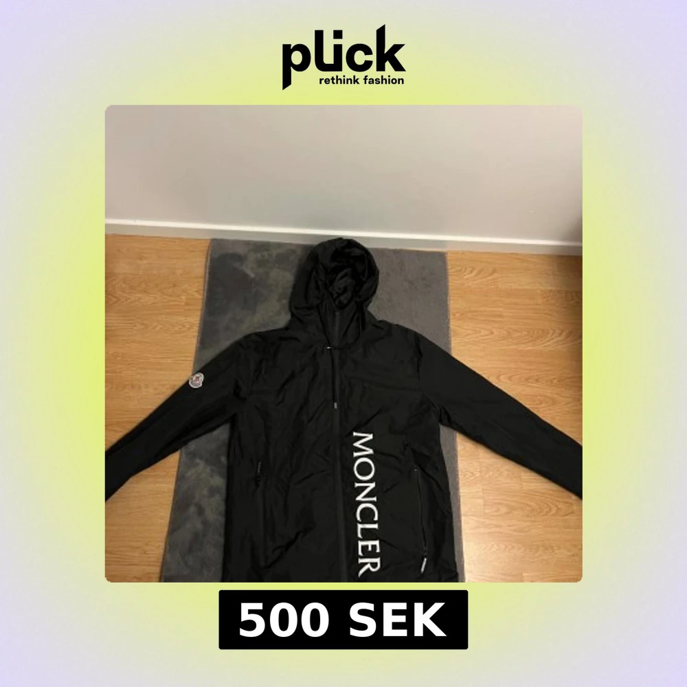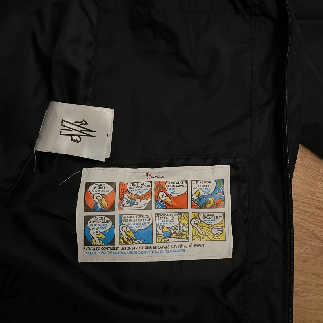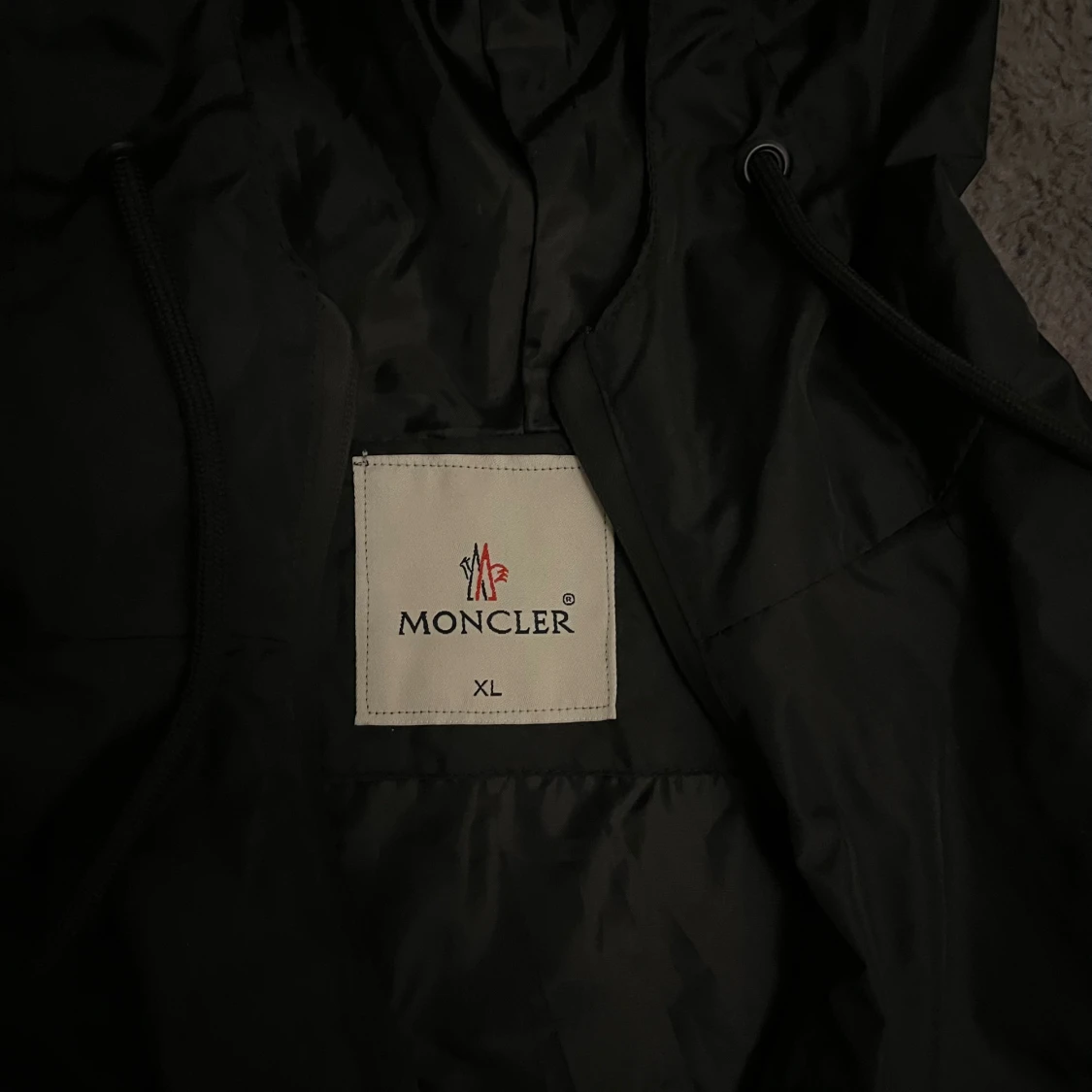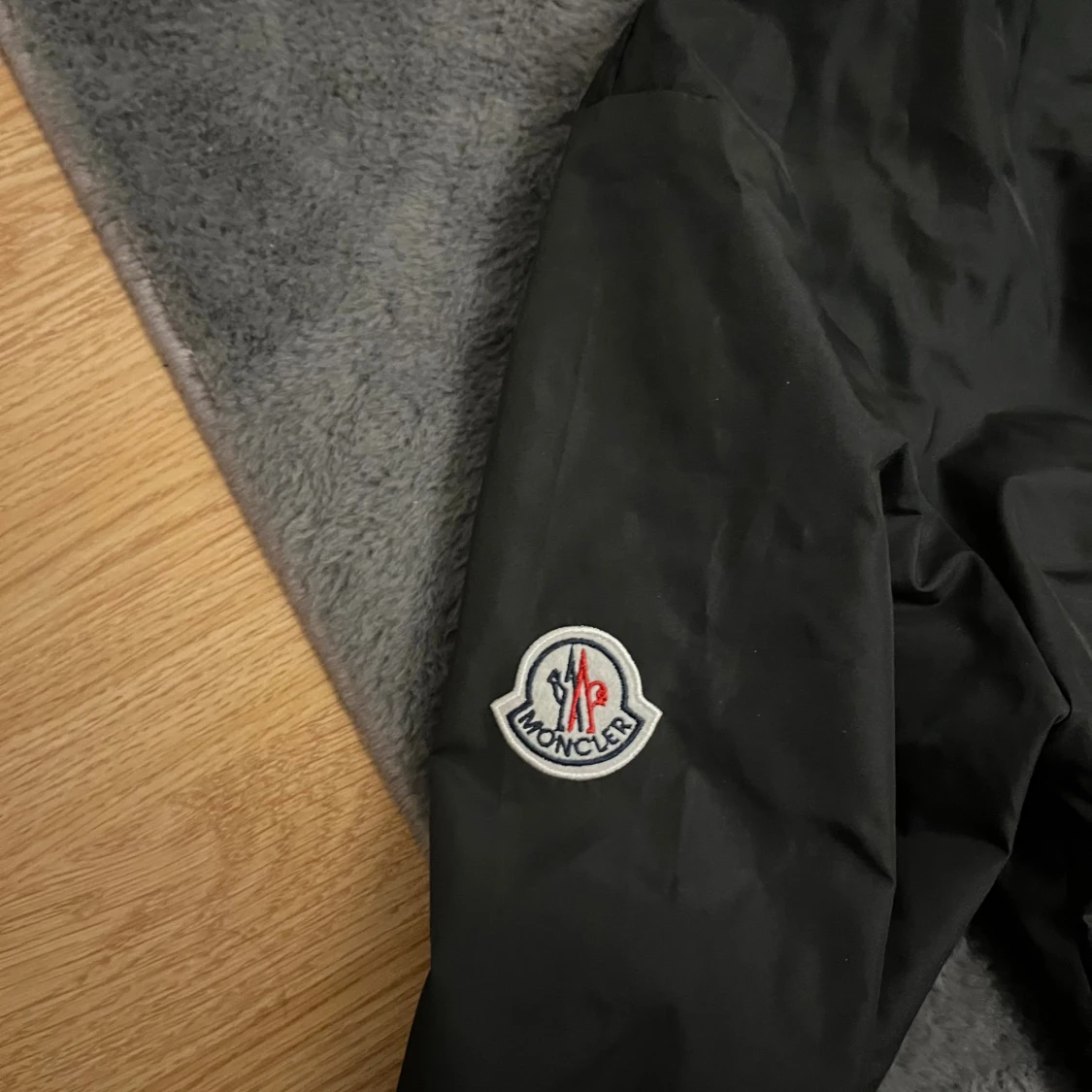 Svart vindjacka från Moncler med stor vit logotyp längs framsidan och klassisk Moncler-patch på ärmen. Jackan har huva, dragkedja och två sidofickor med zip. Priset kan ändras