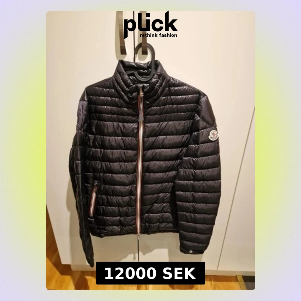 Svart pufferjacka från Moncler med quiltad design och klassisk logotyp på ärmen. Jackan har ståkrage, hel dragkedja med röd, vit och blå rand, samt två sidofickor med matchande dragkedjor. Materialet är glansig polyester och jackan är långärmad. Helt ny använt 2 gånger storlek 1(s)