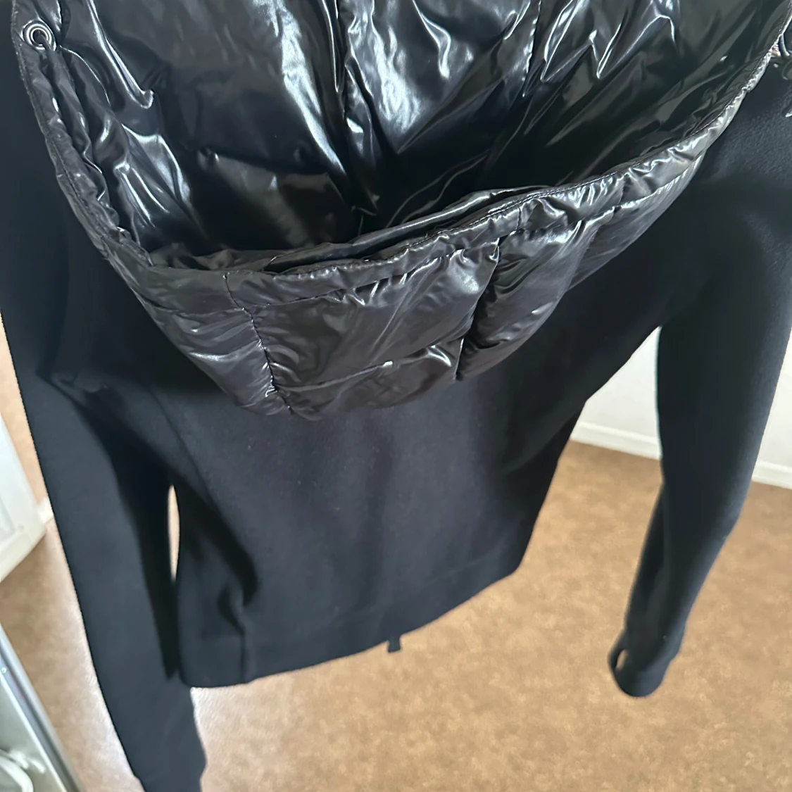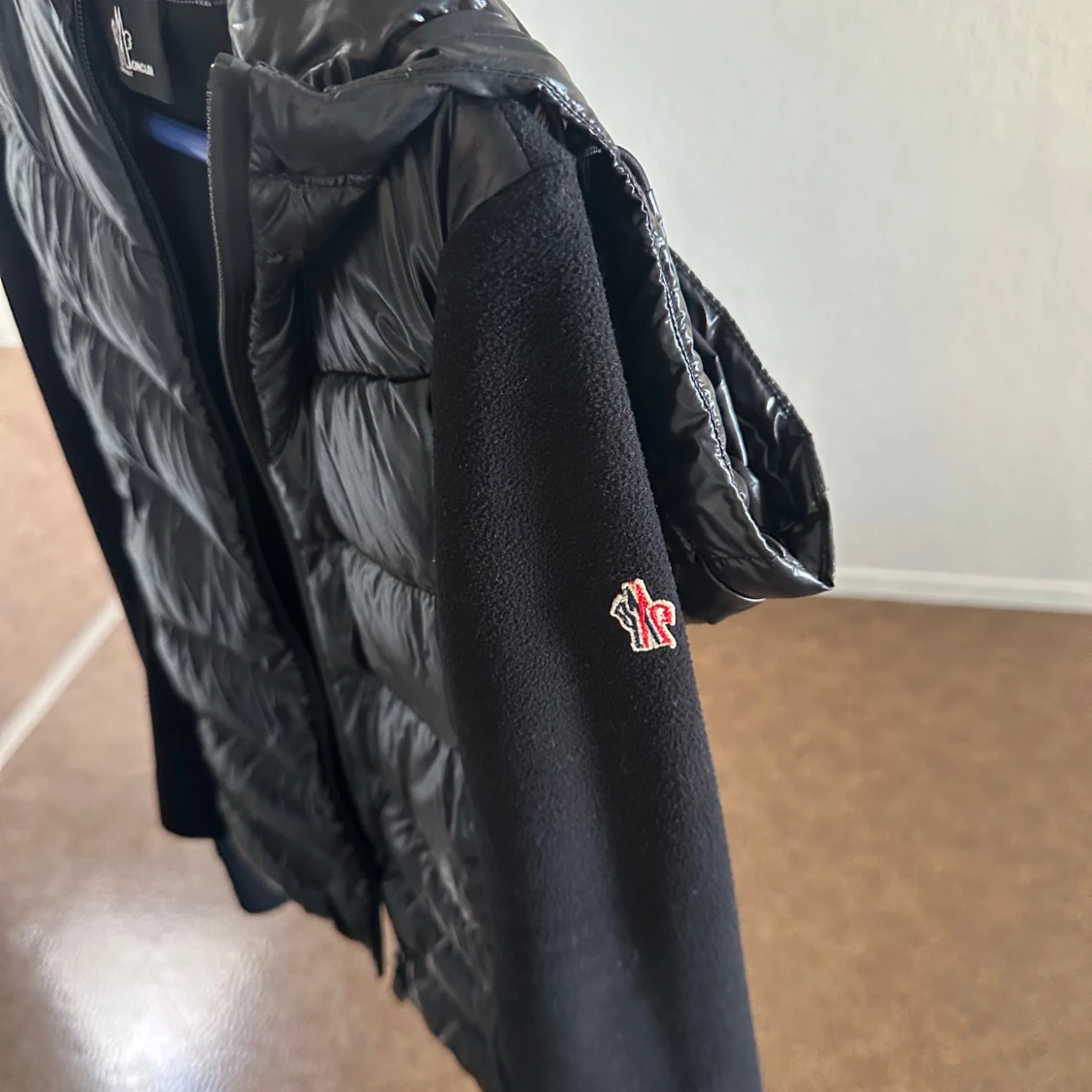 Snygg svart jacka från Moncler med glansig pufferdesign framtill och mjuka ärmar. Jackan har en dragkedja och en hög krage för extra stil och värme. Perfekt för kyligare dagar när du vill hålla stilen.