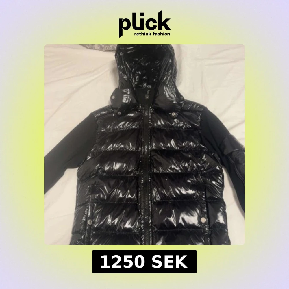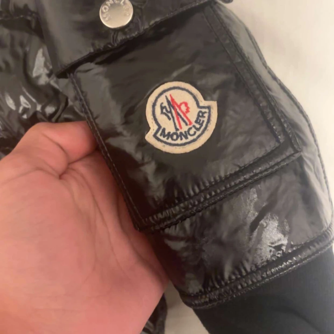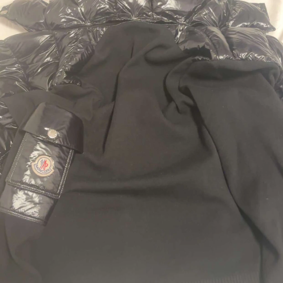 Snygg svart pufferjacka från Moncler med glansig finish och huva. Jackan har stickade ärmar och Moncler-logga på ena ärmen. Dragkedja framtill och praktiska fickor med tryckknappar. Perfekt för dig som vill ha en stilren och trendig look.