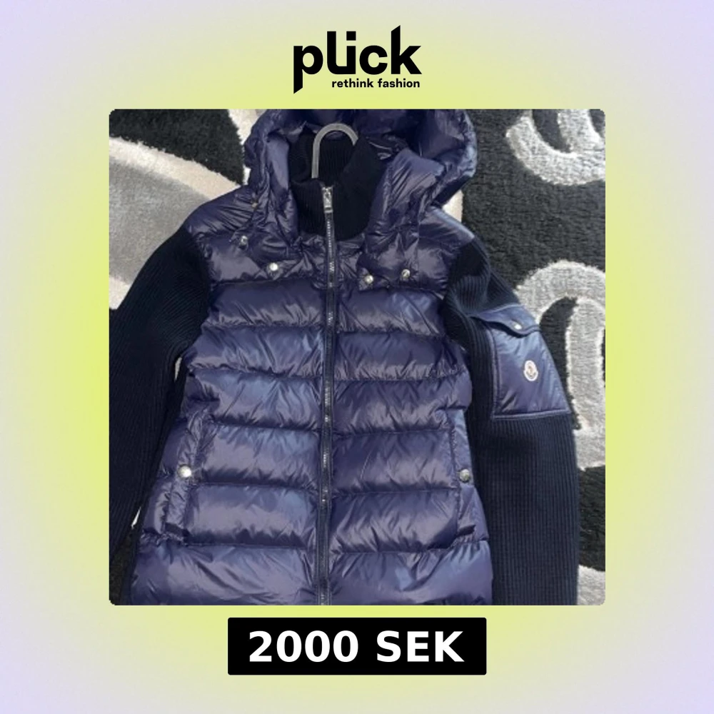 Snygg blå dunväst från Moncler med stickade svarta ärmar och huva. Inga defekter helt ny!