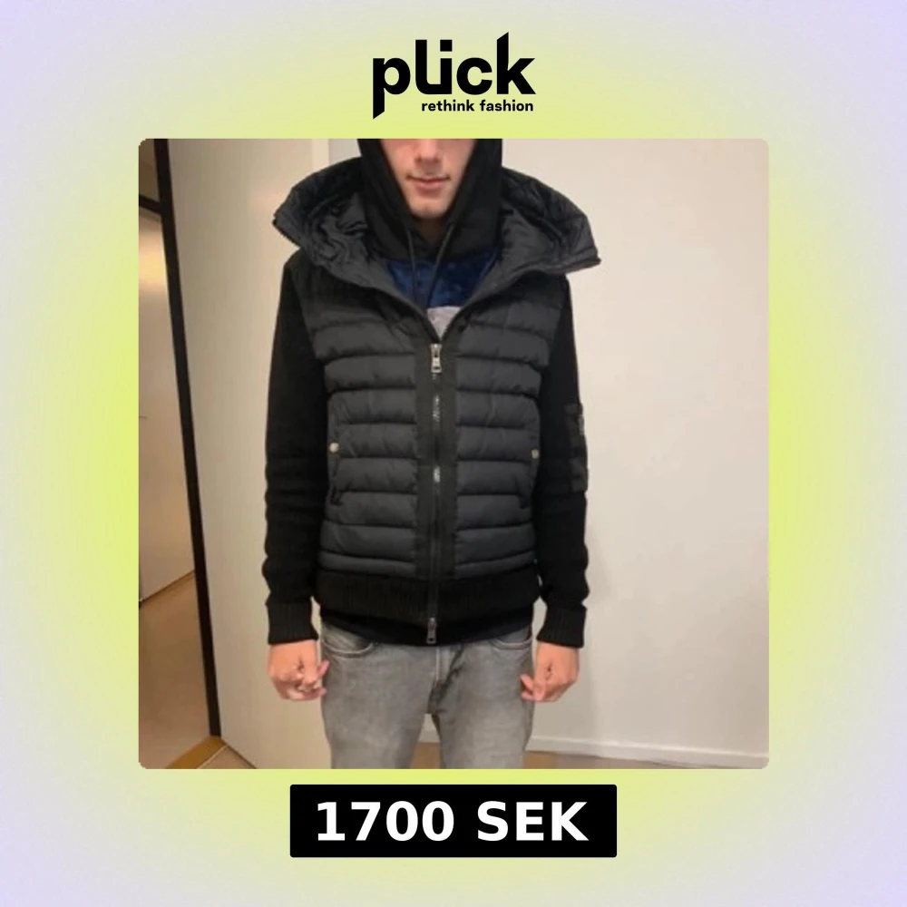 Svart pufferjacka från Moncler med stickade ärmar och quiltade detaljer. Jackan har huva, dragkedja framtill och en extra ficka med dragkedja på ärmen. Klassisk Moncler-logga på vänster ärm. Perfekt för kyliga dagar.
