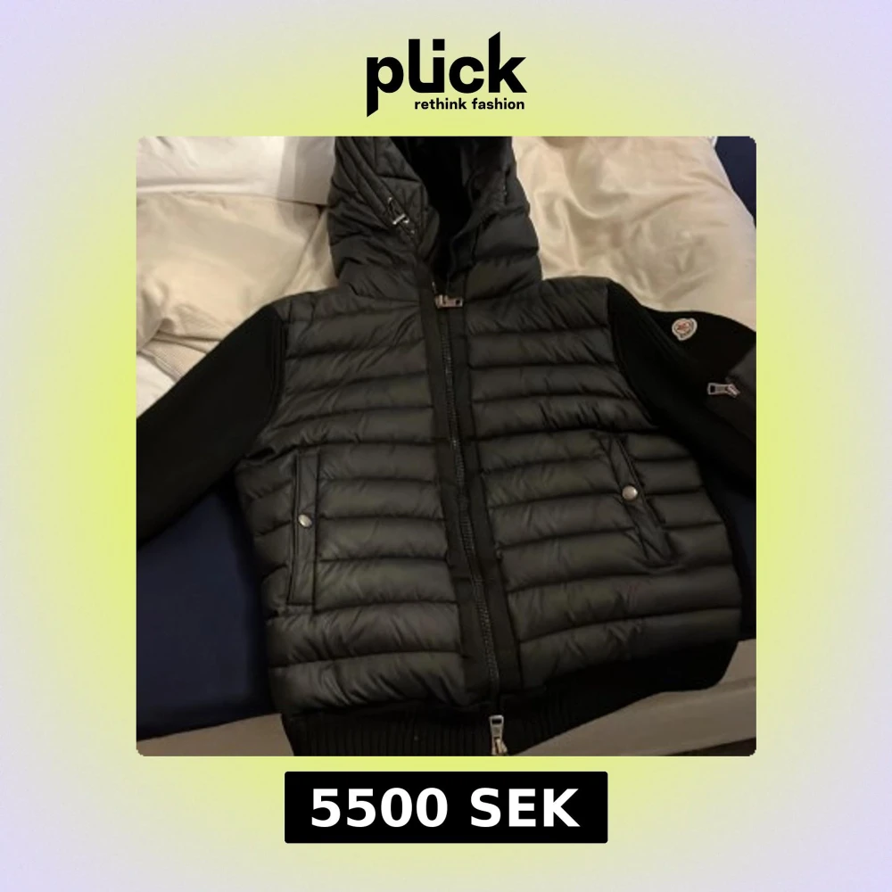 Snygg svart dunjacka från Moncler med huva och dragkedja. Jackan har långa ärmar och ribbade muddar. Praktiska fickor med knappar och en extra ficka på ärmen. Perfekt för kyliga dagar.