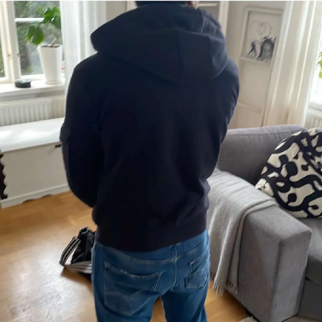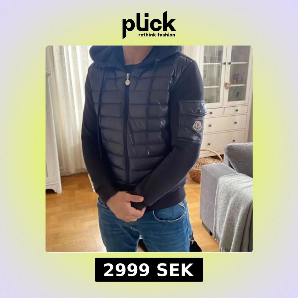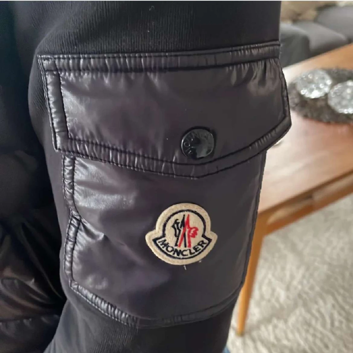Säljer en snygg svart jacka från Moncler med quiltad design och dragkedja. Jackan har en huva och en ficka med knappdetalj på ärmen. Perfekt för kyligare dagar. Och kan byta