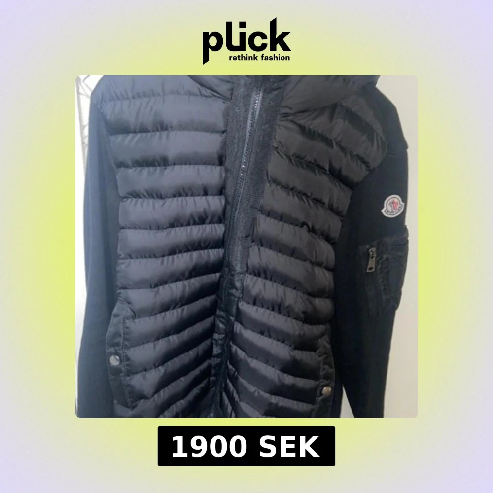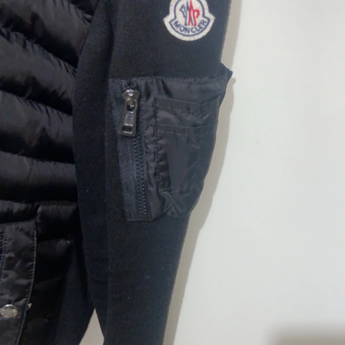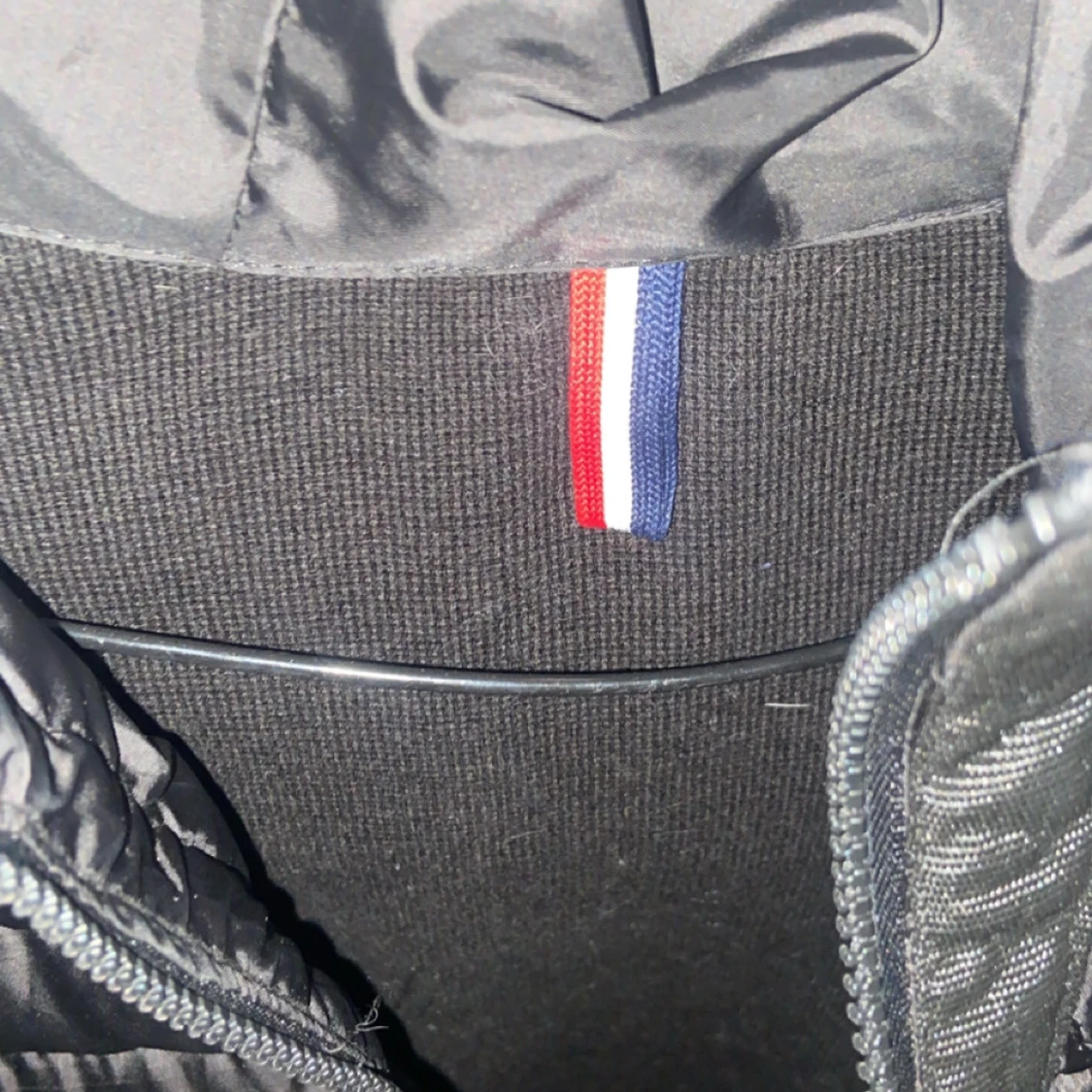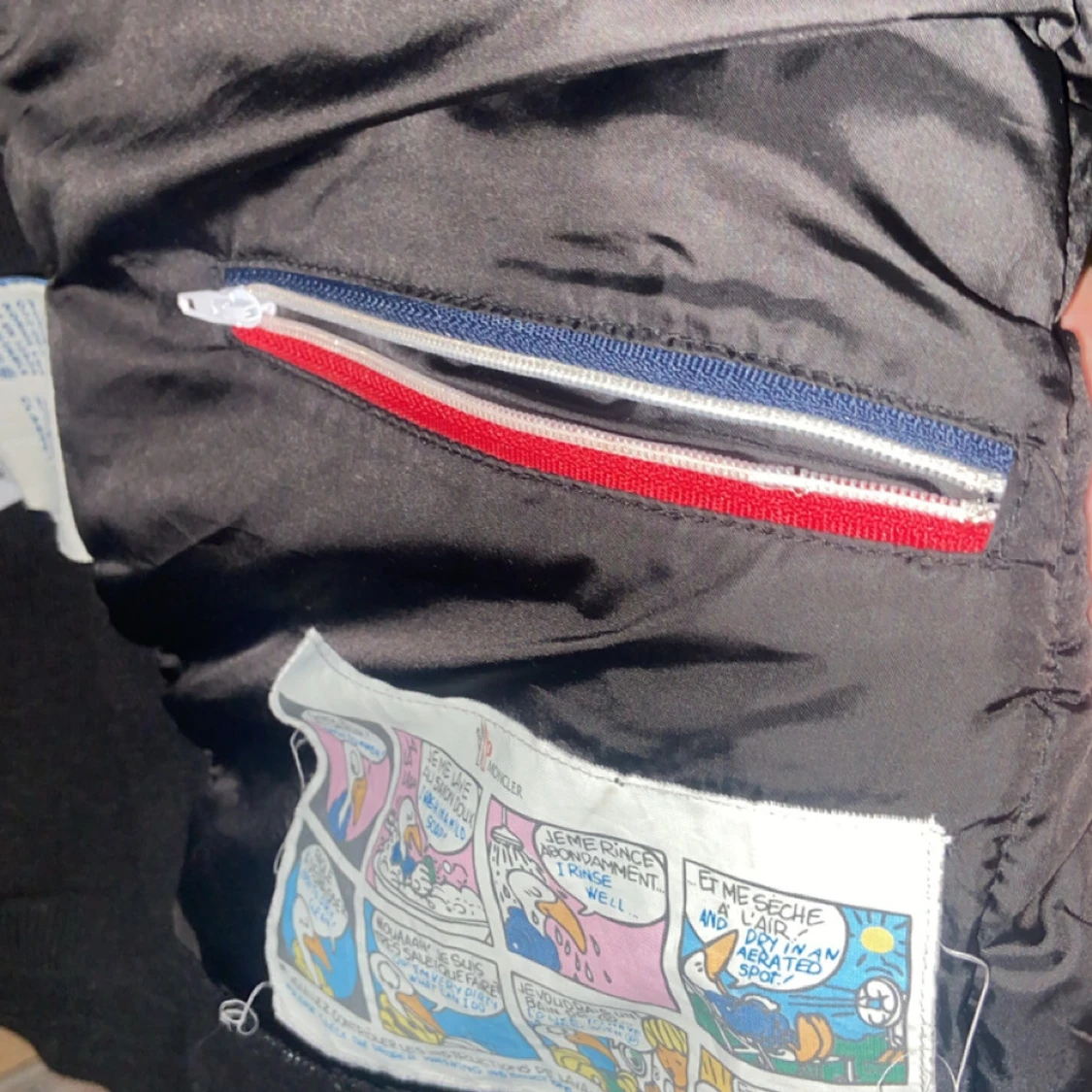 Säljer en svart pufferjacka från Moncler med quiltade partier framtill och på huvan. Jackan har dragkedja, ficka med dragkedja på ärmen och Moncler-logga på axeln. Insidan har en serietidningsdetalj och färgade dragkedjor.