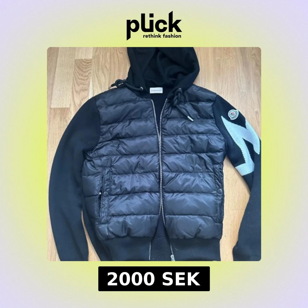Snygg svart cardigan från Moncler med stickade ärmar och huva. Jackan har dragkedja framtill, coolt blixtmönster i grått på ena ärmen och Moncler-logga. Perfekt för dig som vill ha en streetig och exklusiv look. Inga tecken på användning. !PRIS KAN SÄNKAS VID SNABB AFFÄR!