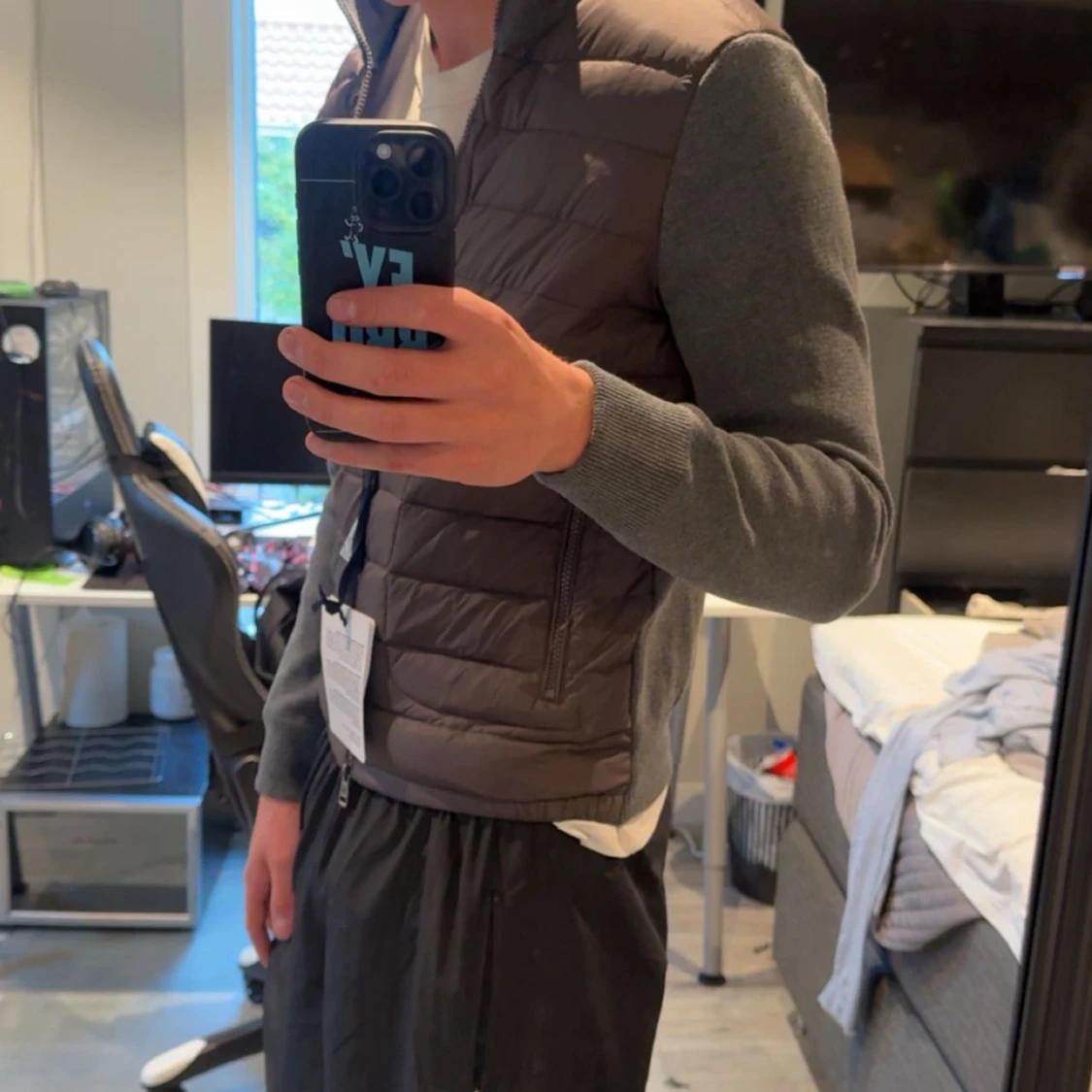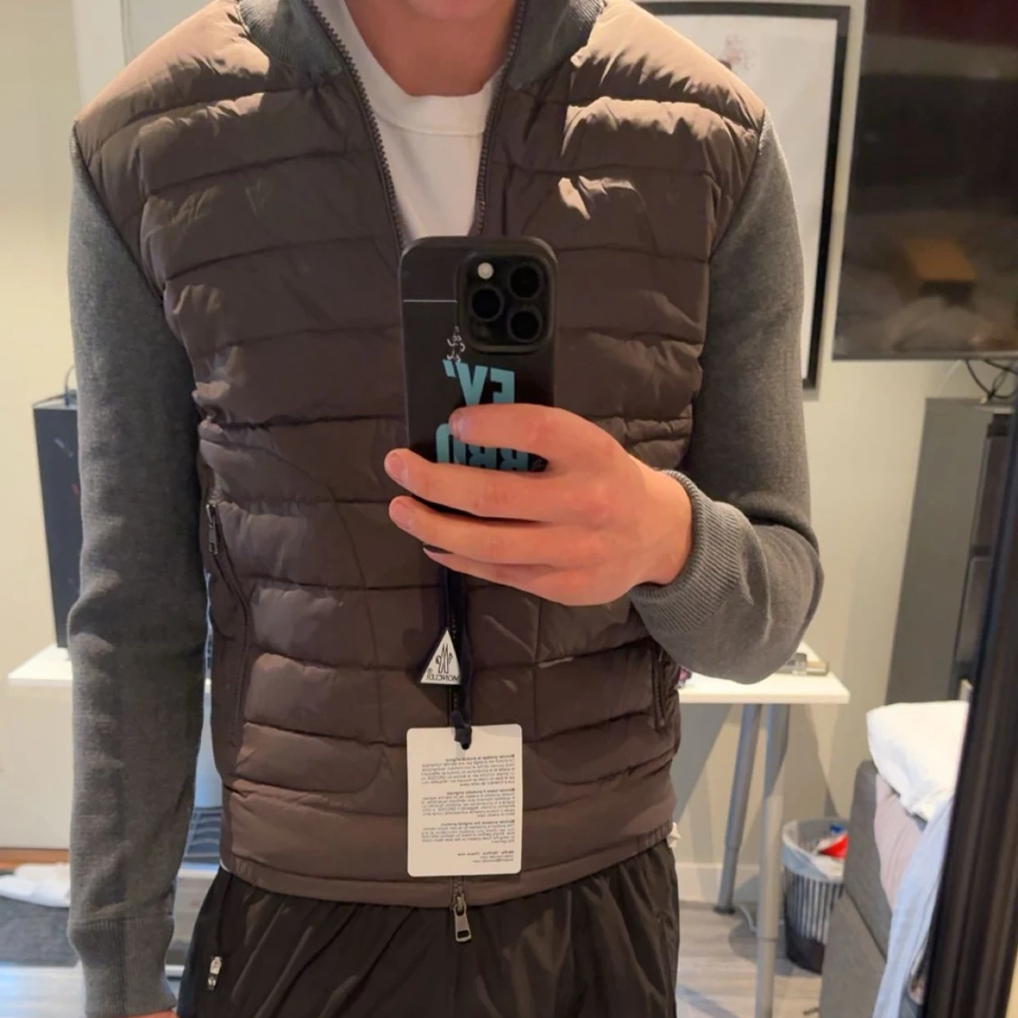 Brun quiltad väst från Moncler med grå ärmar