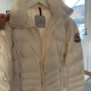 Säljer en snygg vit dunjacka från Moncler med dragkedja. Jackan har Moncler-logga på ärmen och är perfekt för kyliga dagar. Den är stilren och håller dig varm hela vintern. Den är absolut använd men i väldigt fint skick och jag har äkthetsbevis att skicka med!! PRIS KAN DISKUTERAS
