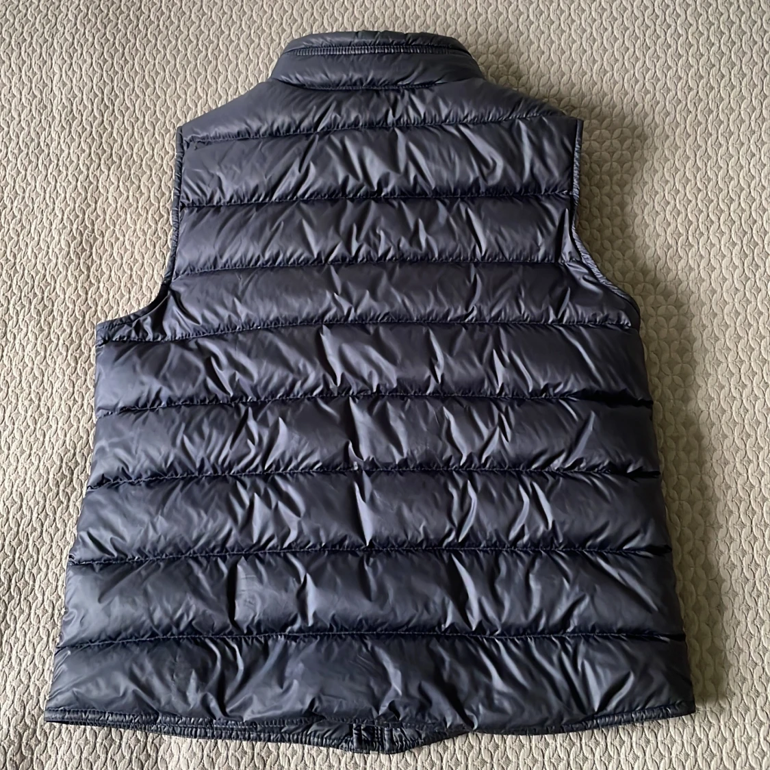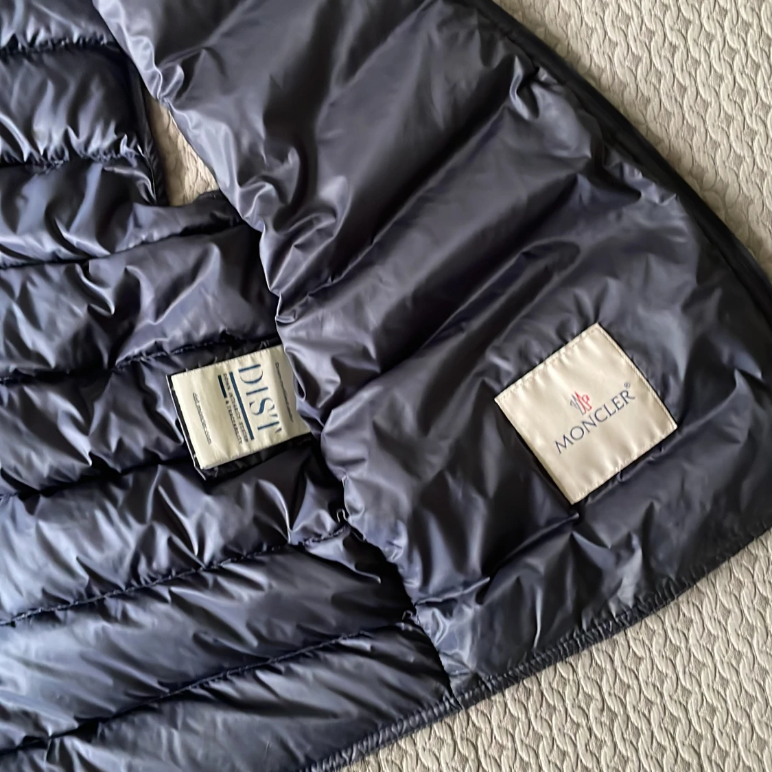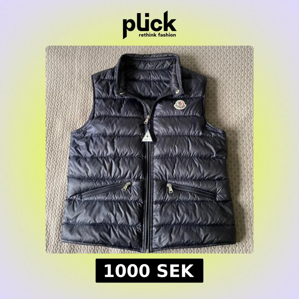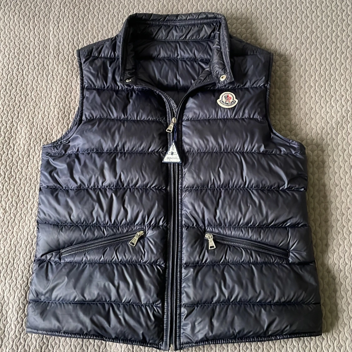 Säljer nu min moncler väst då det börjar bli för liten, jag är 165 cm lång. Snygg mörkblå dunväst från Moncler med quiltad design och hög krage. Västen har två praktiska fickor med dragkedja och klassisk Moncler-logga på bröstet.