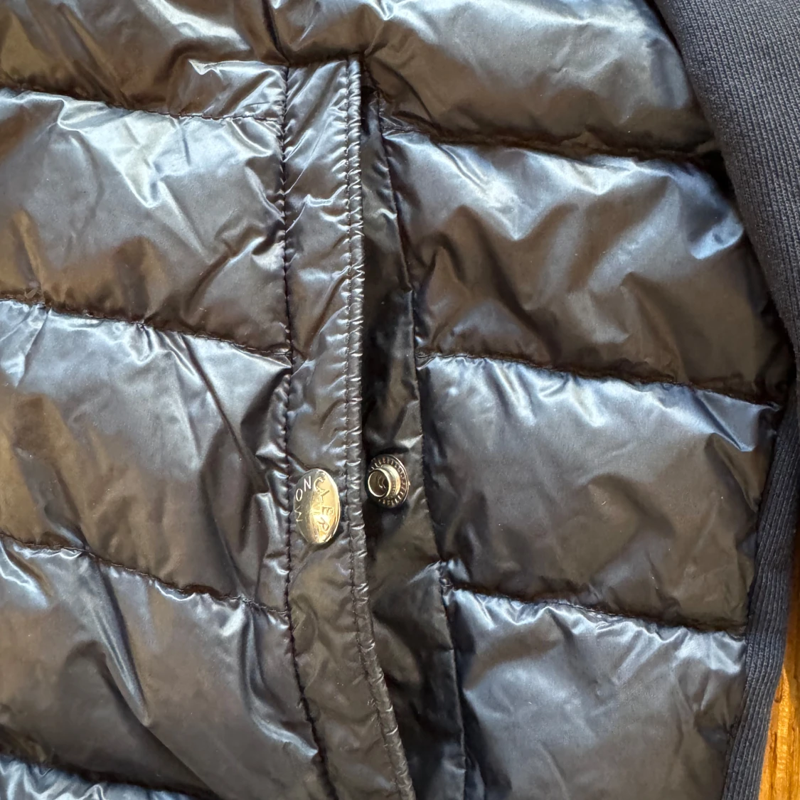 Snygg svart Cardigan från Moncler med långa ärmar och dragkedja. Jackan har ett quiltat mönster och ribbad krage med röd och vit detalj. Perfekt för kyligare sommarkvällar. Hör av er för frågor eller funderingar.