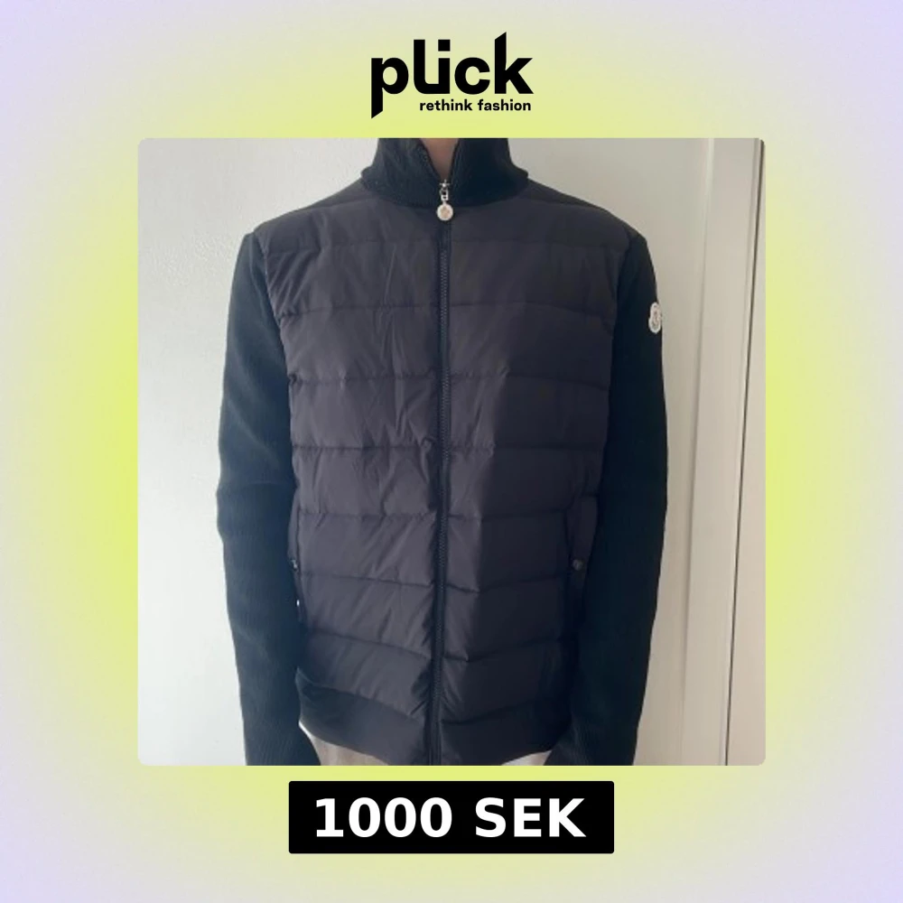 Säljer en svart pufferjacka från Moncler med stickade ärmar och hög krage. Jackan har dragkedja framtill, quiltad front och Moncler-logga på ärmen. Snygg röd Moncler-text längs sidan på ärmen ger en sportig vibe. Perfekt för höst och vinter. Passar för er i L-XL helt ny.