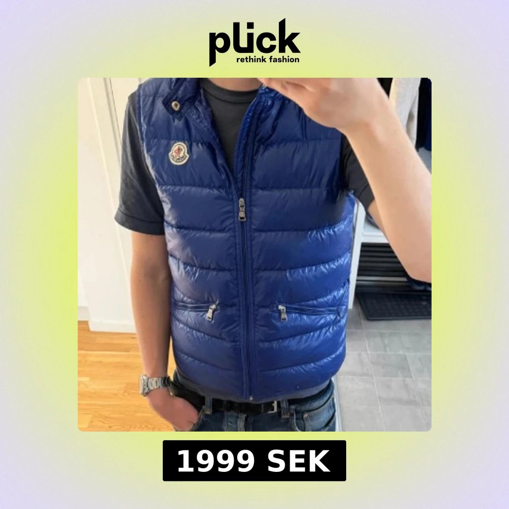 Blå dunväst från Moncler - Säljer en snygg blå dunväst från Moncler i mycket bra skick. Västen har en dragkedja framtill och två praktiska fickor med dragkedjor. Perfekt för höst och vår när du vill hålla dig varm men ändå se stilren ut. Moncler-loggan är broderad på bröstet. Passar både till vardags och lite finare tillfällen.