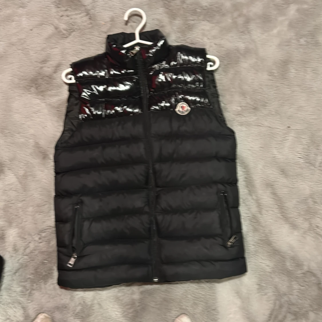 Svart pufferjacka från Moncler - Snygg svart pufferjacka från Moncler med quiltad front och stickade ärmar. Jackan har dragkedja framtill, två fickor och Moncler-logga på ena ärmen. Perfekt för dig som vill ha en stilren och exklusiv look.