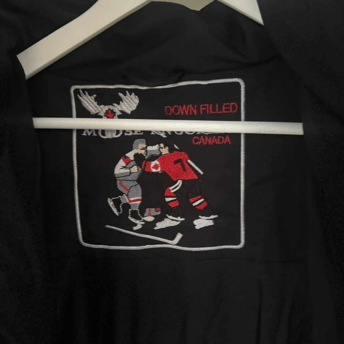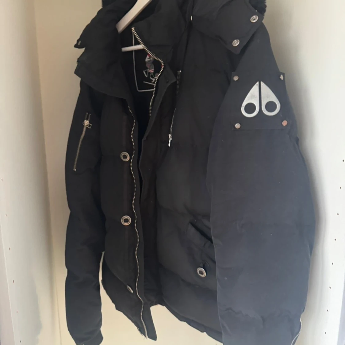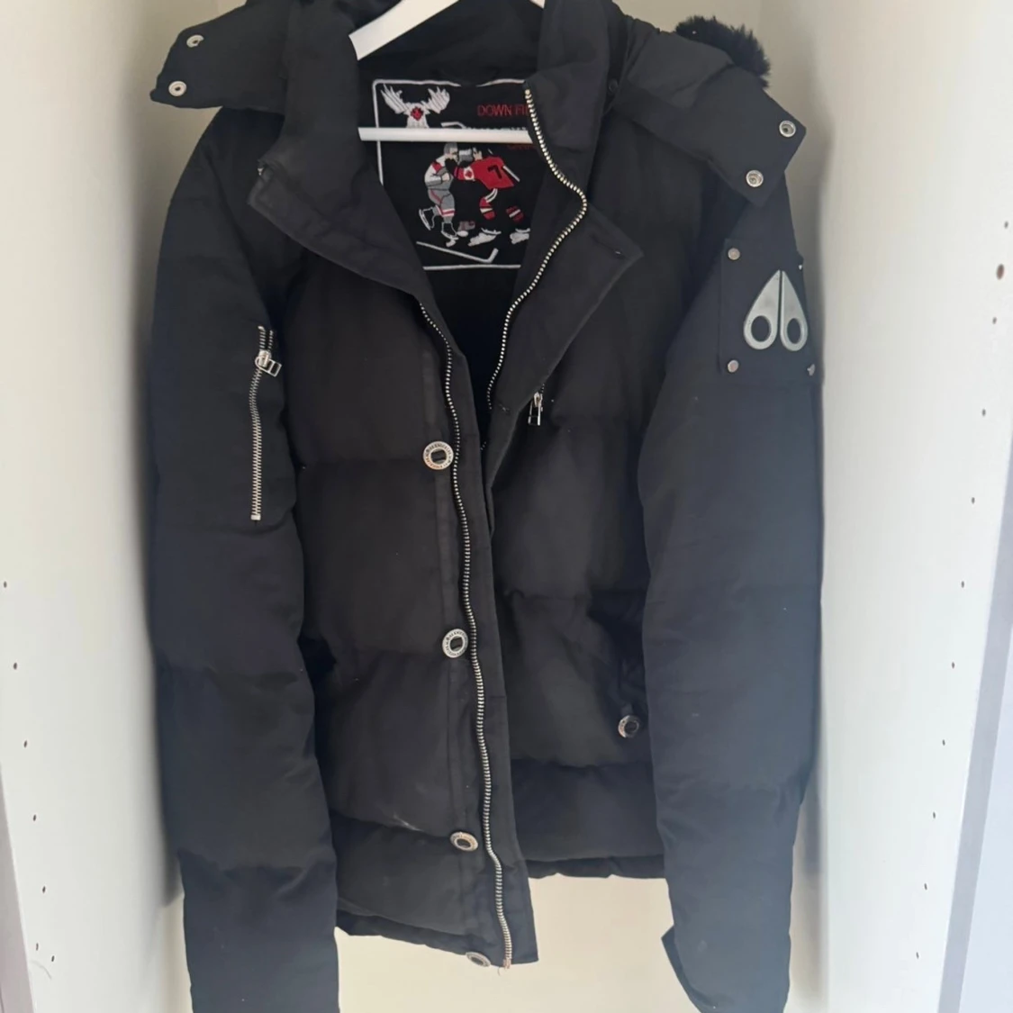 Säljer en svart dunjacka från Moose Knuckles med ikonisk logga på ärmen och broderad hockeypatch på insidan. Jackan har stora silverfärgade knappar, dragkedjor och en rejäl huva. Perfekt för kalla dagar och riktigt snygg streetstil.