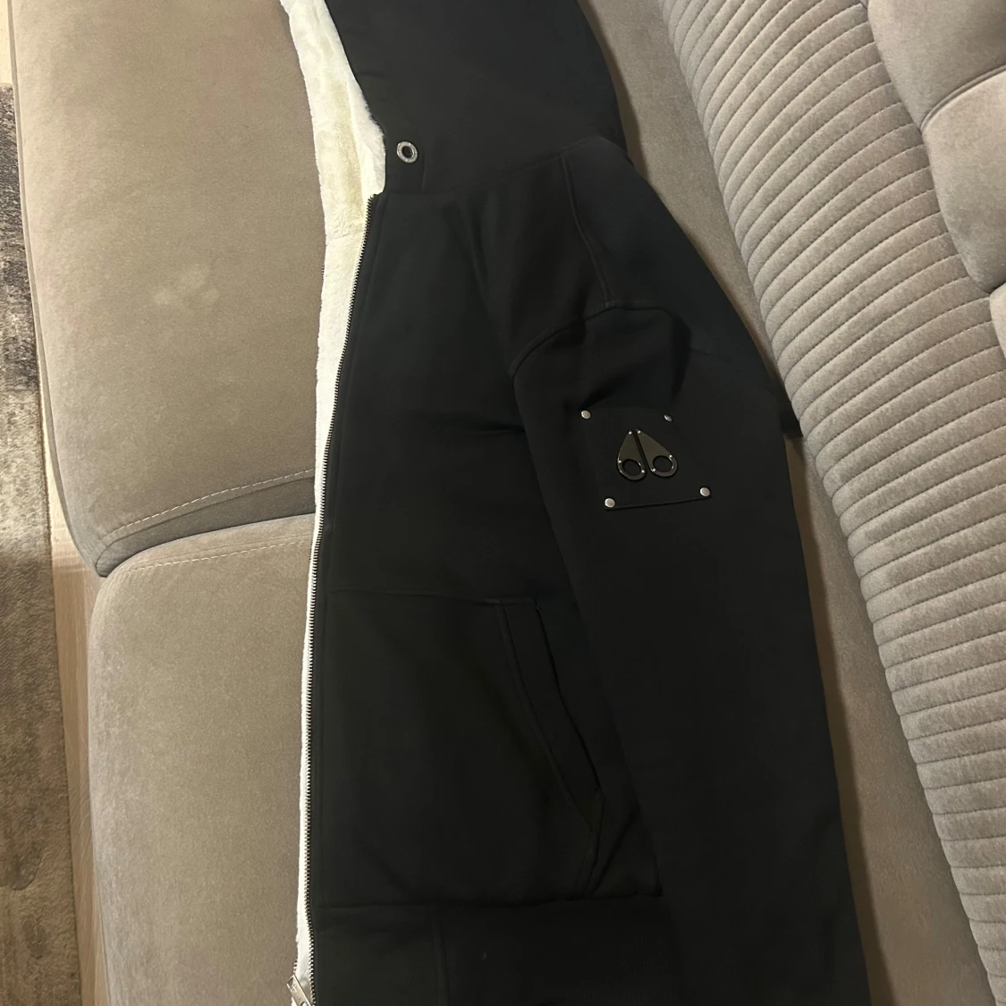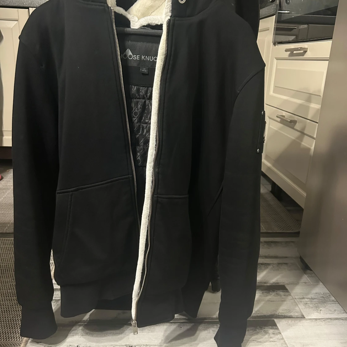 Svart pufferjacka från Moose Knuckles med vit fuskpäls på insidan av huvan och quiltat innerfoder. Jackan har dragkedja framtill, två fickor och logotyp på ärmen. Perfekt för kalla dagar och har en modern, stilren look.