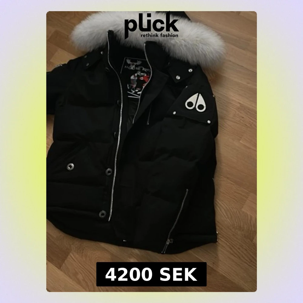 Säljer en svart pufferjacka från Moose Knuckles med stor vit päls runt huvan. Jackan har silverfärgade dragkedjor, knappar och detaljer på ärmen. Märkets logga syns tydligt på axeln. Perfekt för kalla dagar och har en riktigt snygg streetstil.