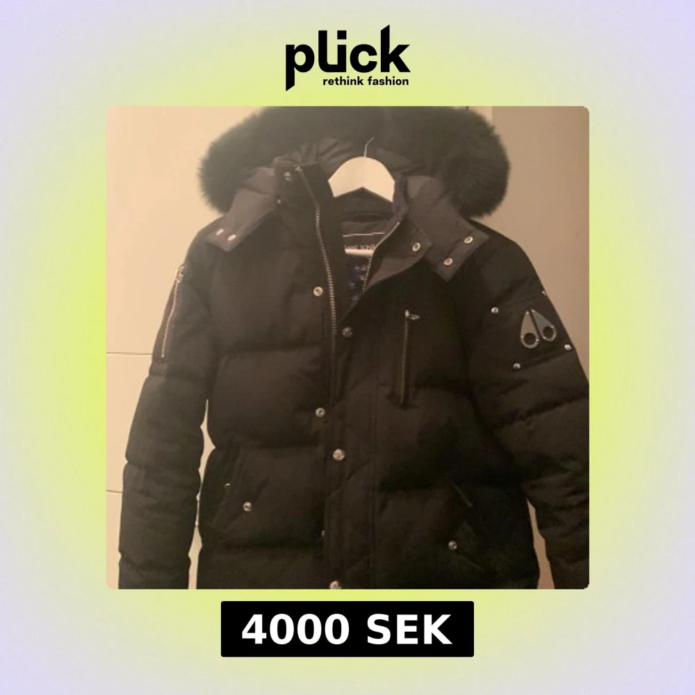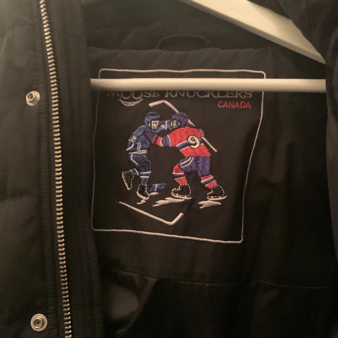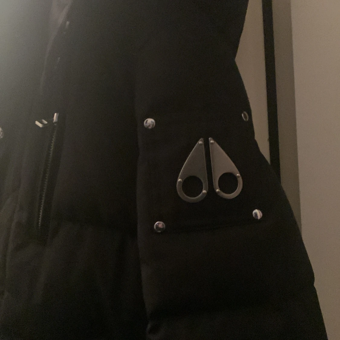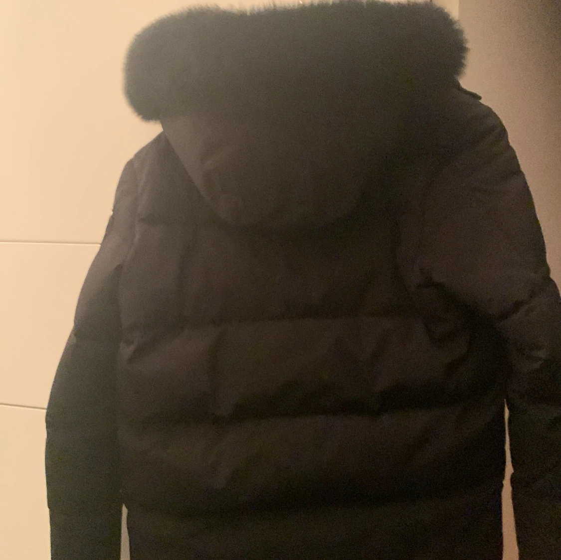 Snygg svart dunjacka från Moose Knuckles med pälsdetaljer på huvan. Jackan har flera fickor med dragkedja och knappar framtill. Perfekt för kalla vinterdagar.