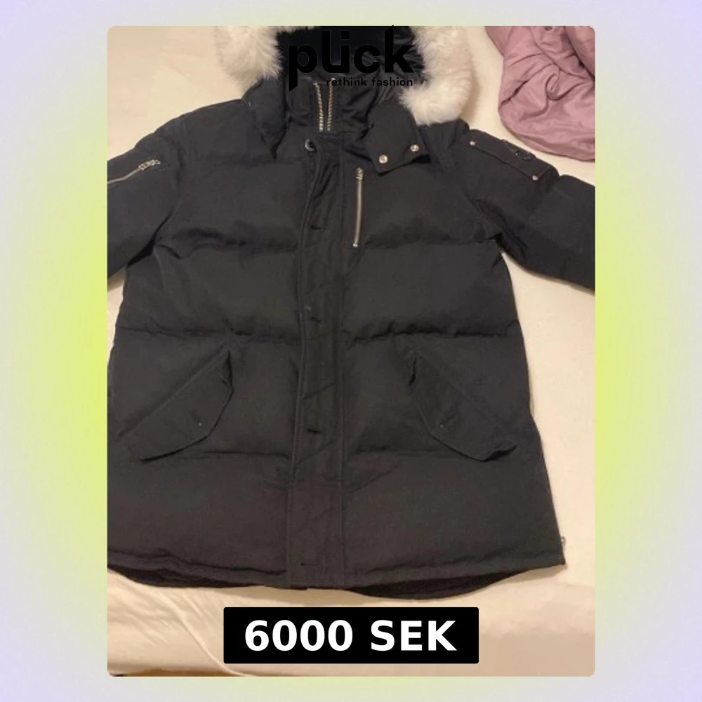 Svart dunjacka från Moose Knuckles med vit päls på huvan, flera dragkedjor och snygga detaljer på ärmen. Jackan har långa ärmar, praktiska fickor och broderad insida med hockeymotiv. Perfekt för kalla dagar och har en cool streetstil.