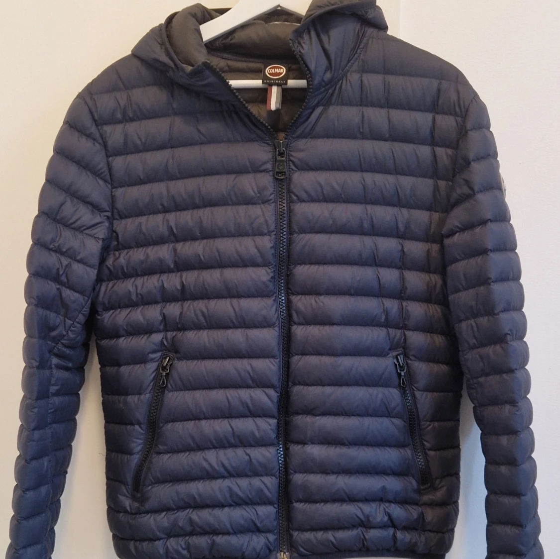 Säljer en mörkblå dunjacka från Colmar med huva och två sidofickor med dragkedja. Jackan har ett quiltat mönster och Colmar-logga på ärmen. Sparsamt använd så mycket fint skick. Storlek 48 (M) men ganska liten i storlek så mer en S.