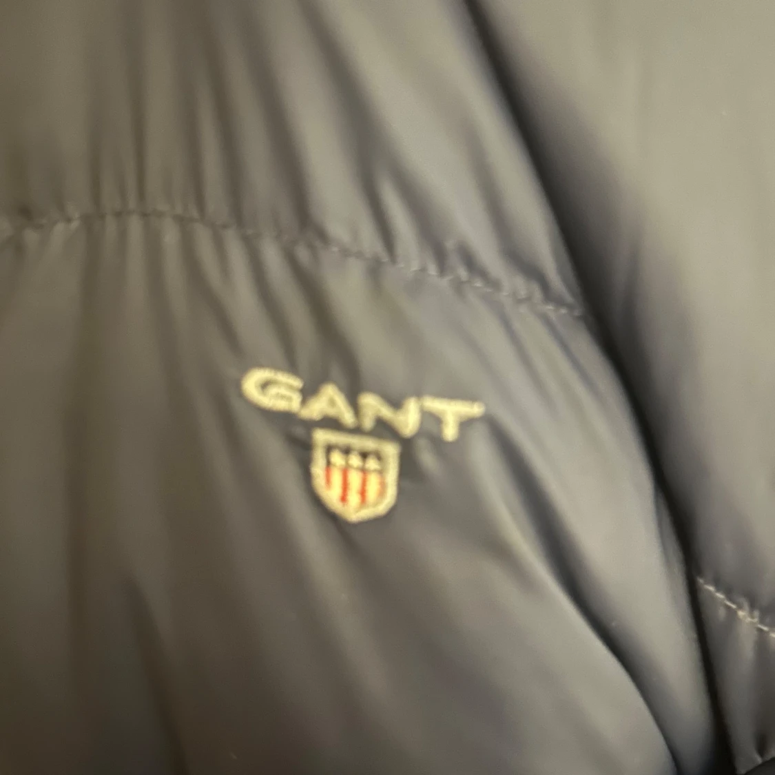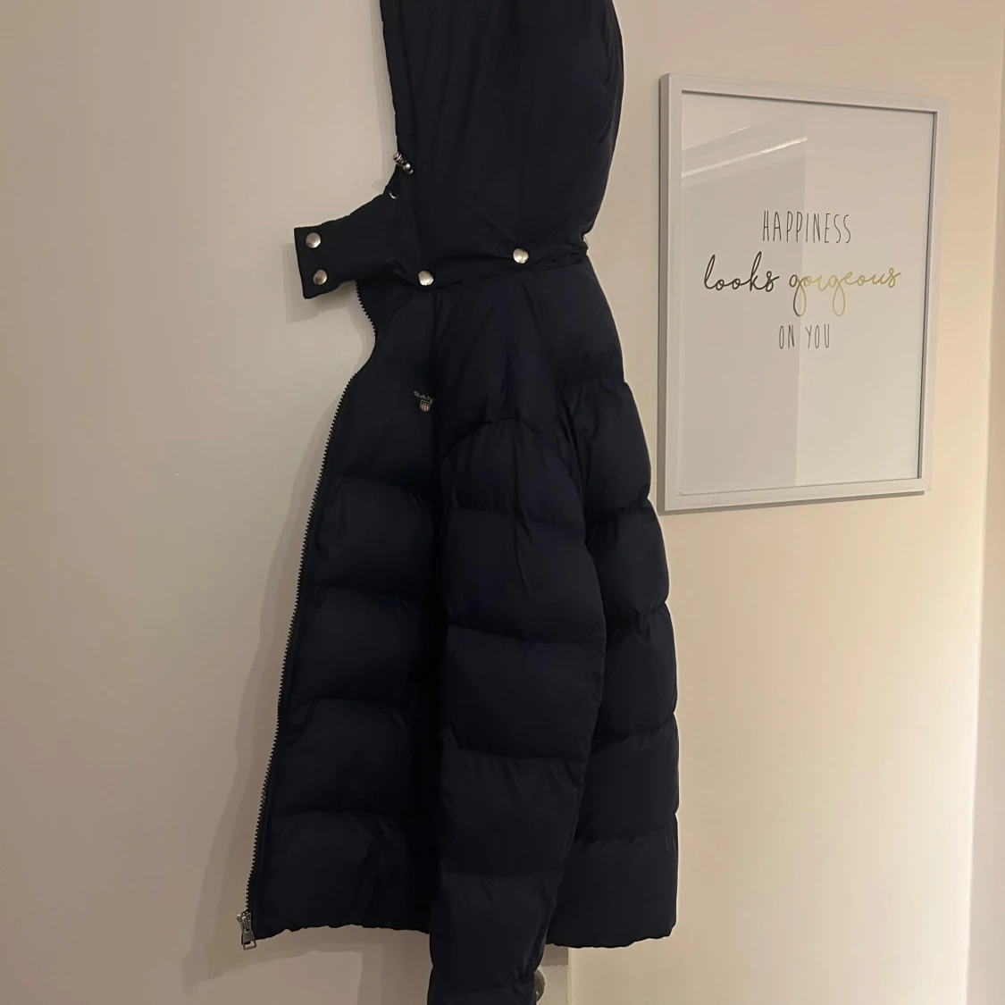Säljer en snygg mörkblå dunjacka från GANT med en cool orange insida. Jackan har en lång design med dragkedja och knappar, perfekt för kalla dagar. Den är märkt för åldern 13-14 år. Vill även tillägga att den är ganska stor i storleken.