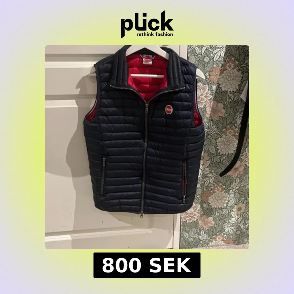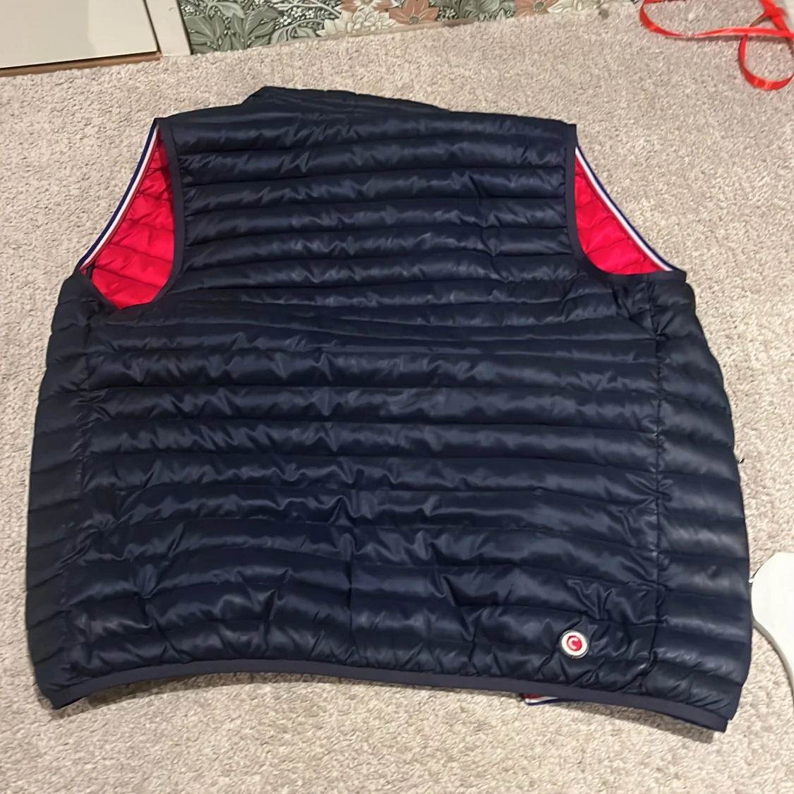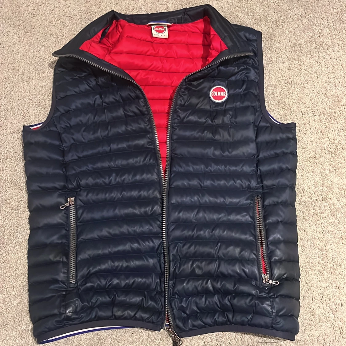 Snygg mörkblå dunväst från Colmar med röd quiltad insida och logotyp på bröstet. Västen har två fickor med dragkedja och en ståkrage. Perfekt för lager-på-lager och har en sportig vibe med horisontella sömmar.