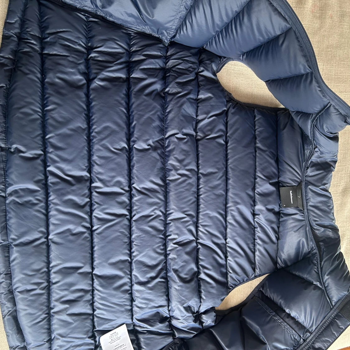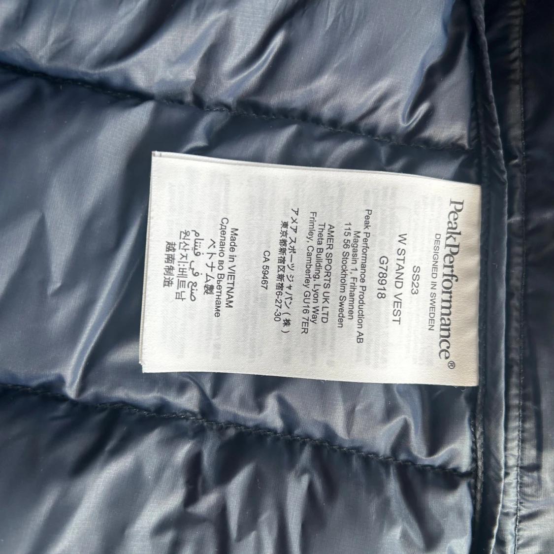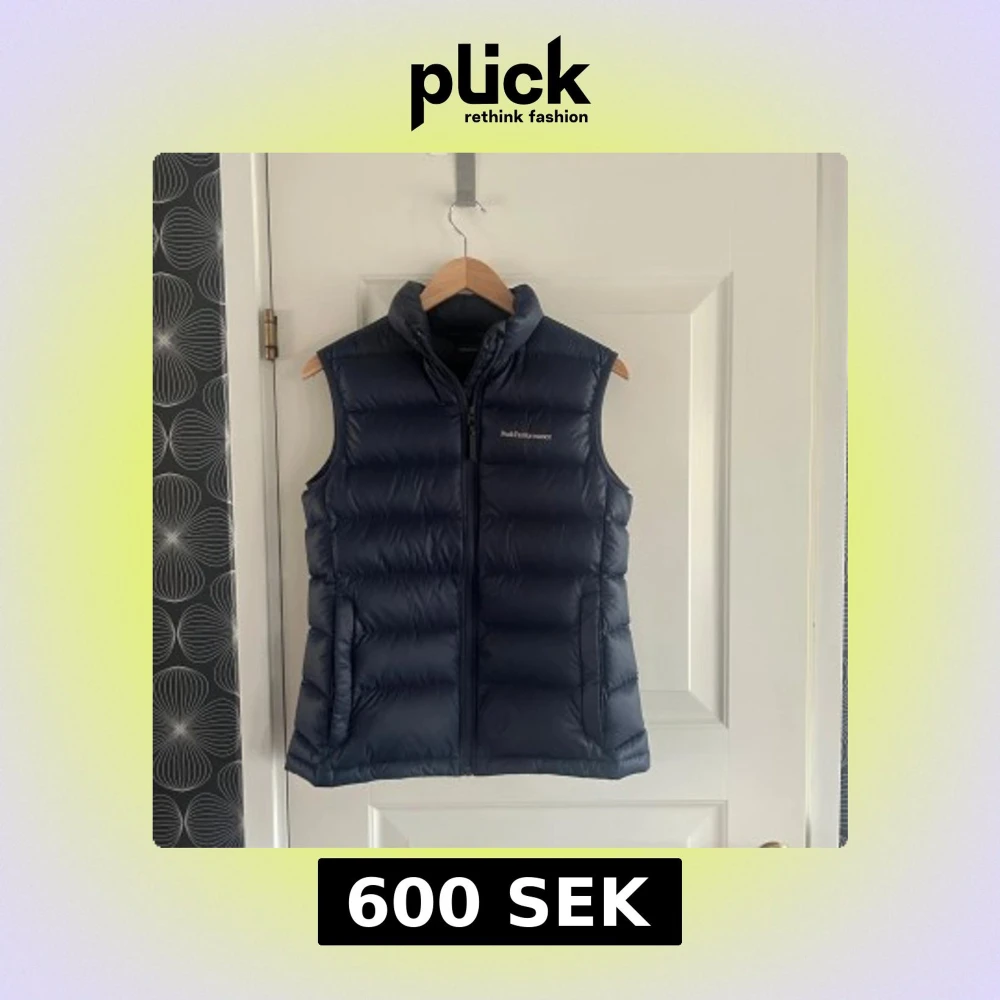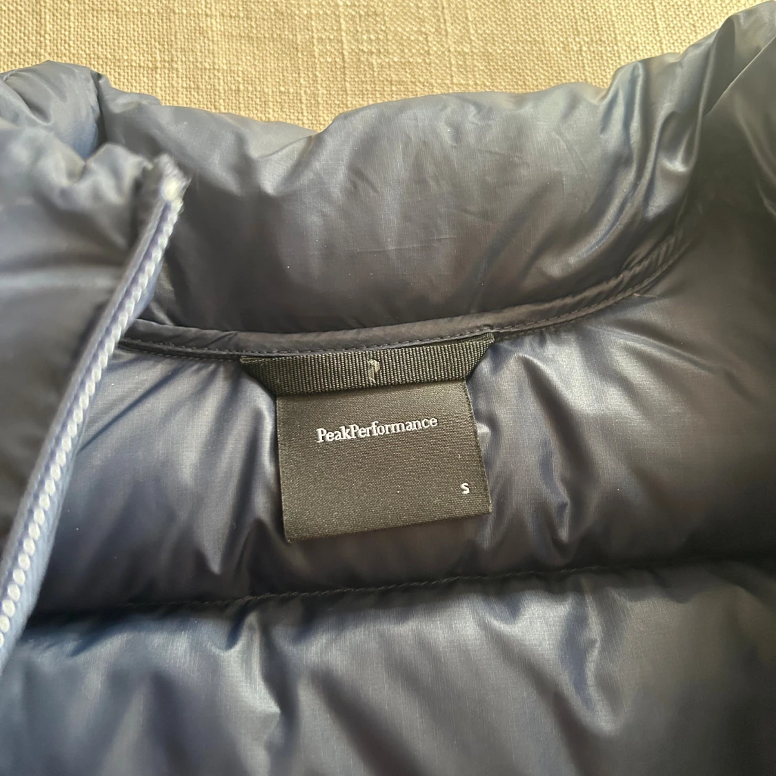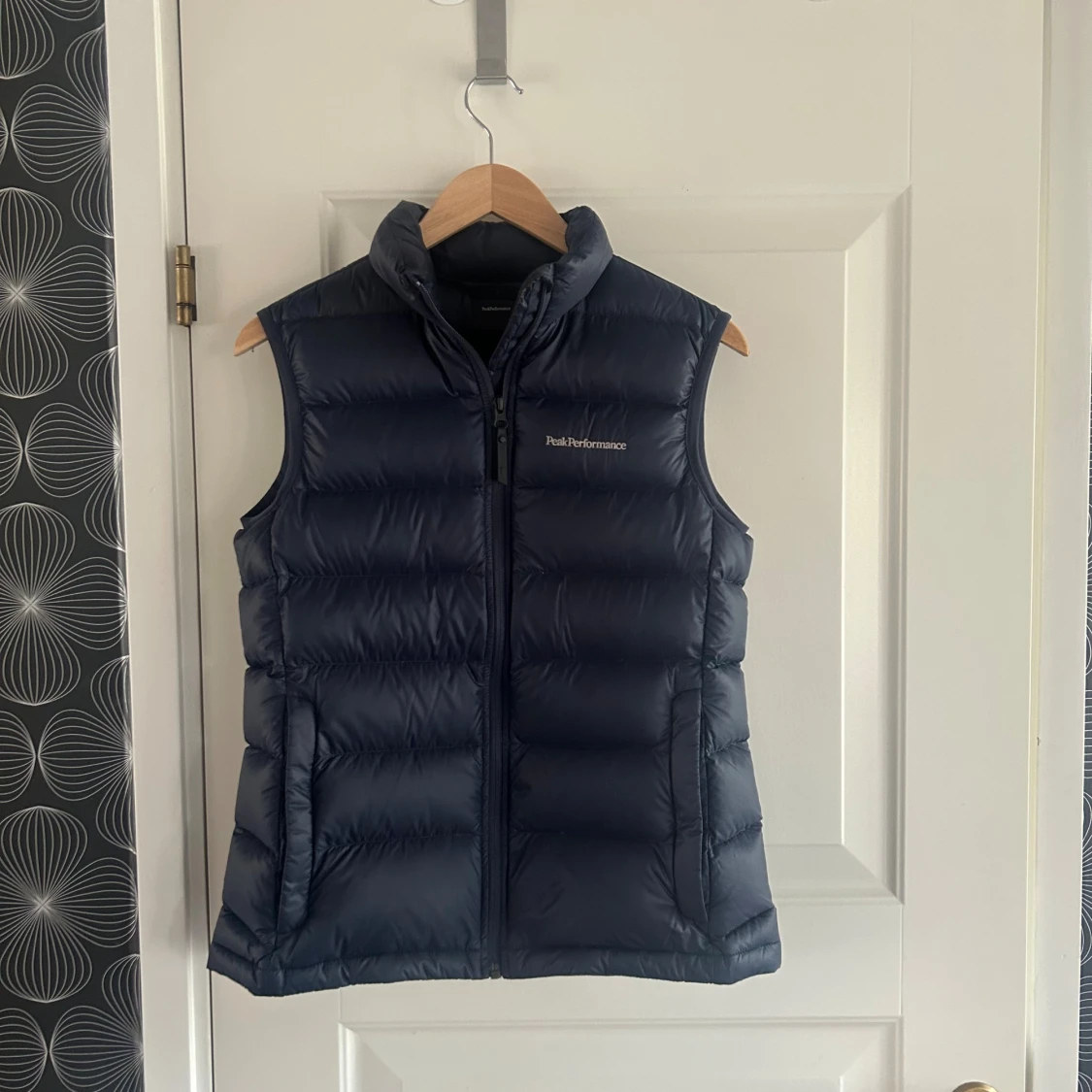 Snygg mörkblå dunväst från Peak Performance i storlek S. Västen har hög krage, diskret logga på bröstet och dragkedja framtill. Perfekt för lager-på-lager och chill höst- eller vinterstil.