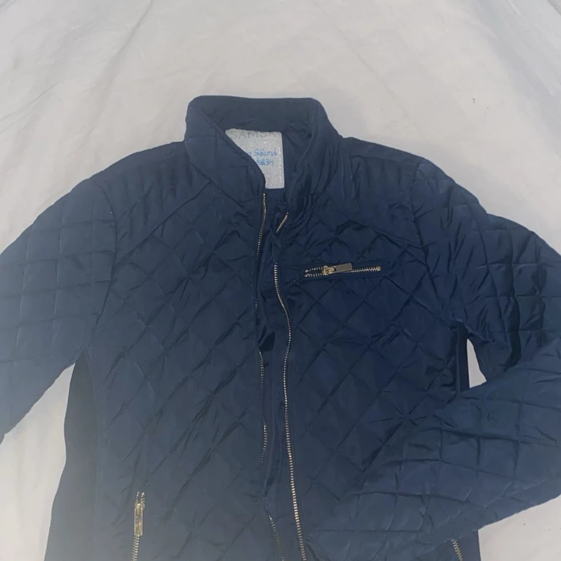 Quiltad mörkblå jacka från Samosa med dragkedjor i silver och ståkrage. Jackan har ett rutigt mönster, lång ärm och flera fickor med dragkedja. Perfekt för dig som gillar en stilren stockholmslook.