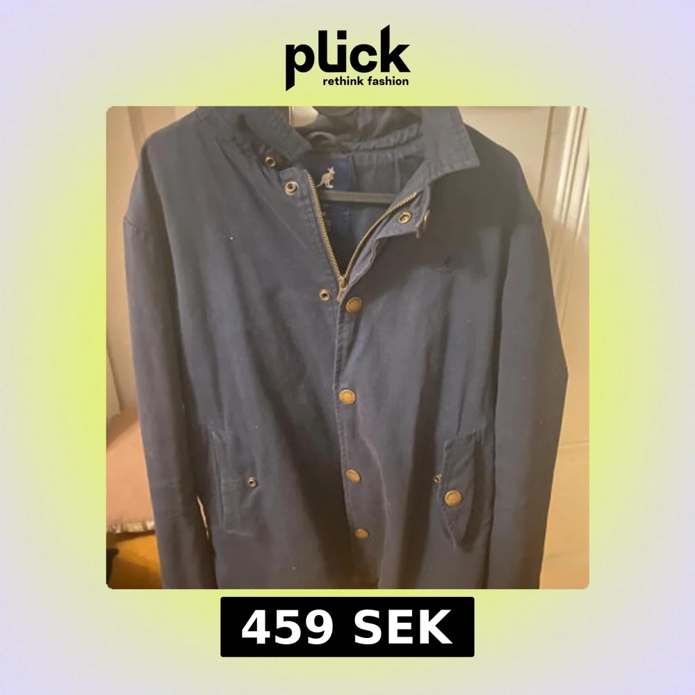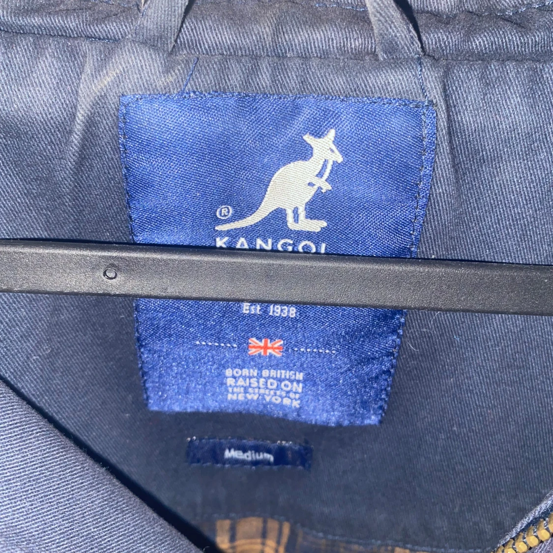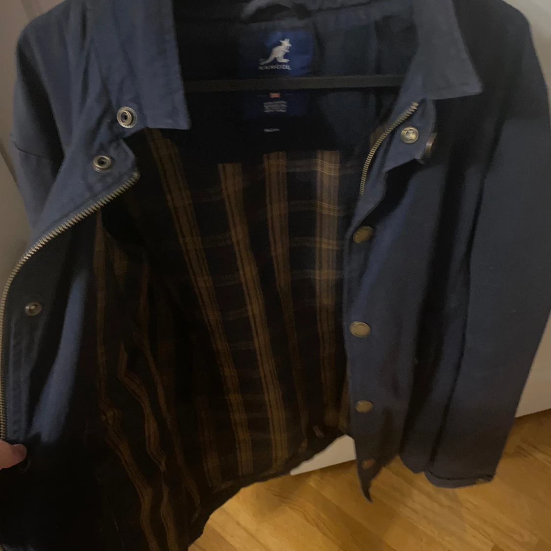 Säljer en stilren mörkblå jacka från Kangol med dragkedja och knappar. Jackan har en klassisk krage och två fickor framtill. Insidan är fodrad med ett rutigt mönster i bruna och beige toner.