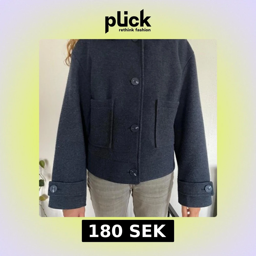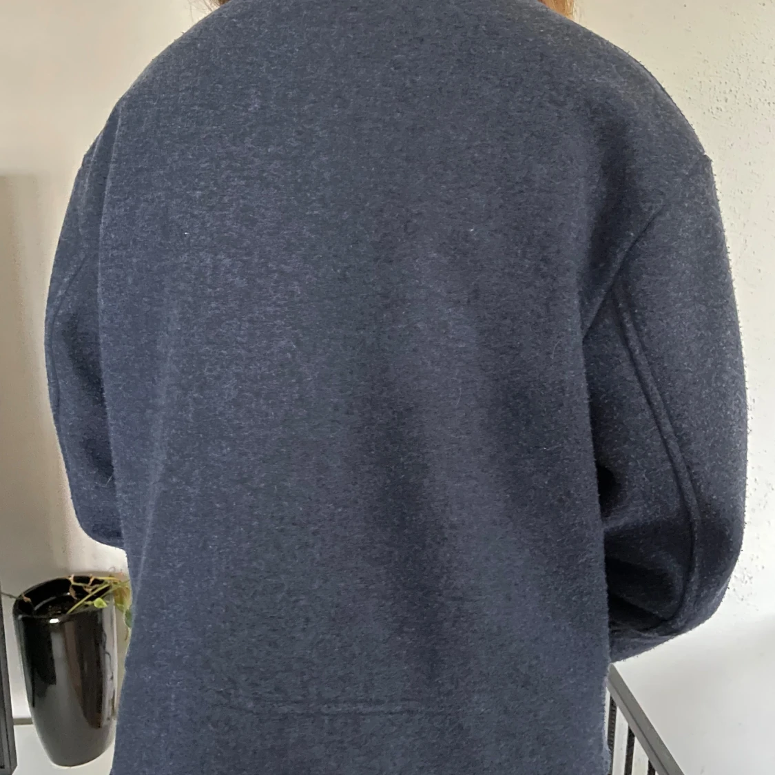 Säljer en mörkblå, rak och lite boxig ulljacka med stora knappar framtill och på ärmsluten. Jackan har två rejäla fickor fram och är långärmad. Perfekt för dig som gillar en clean och stilren look.