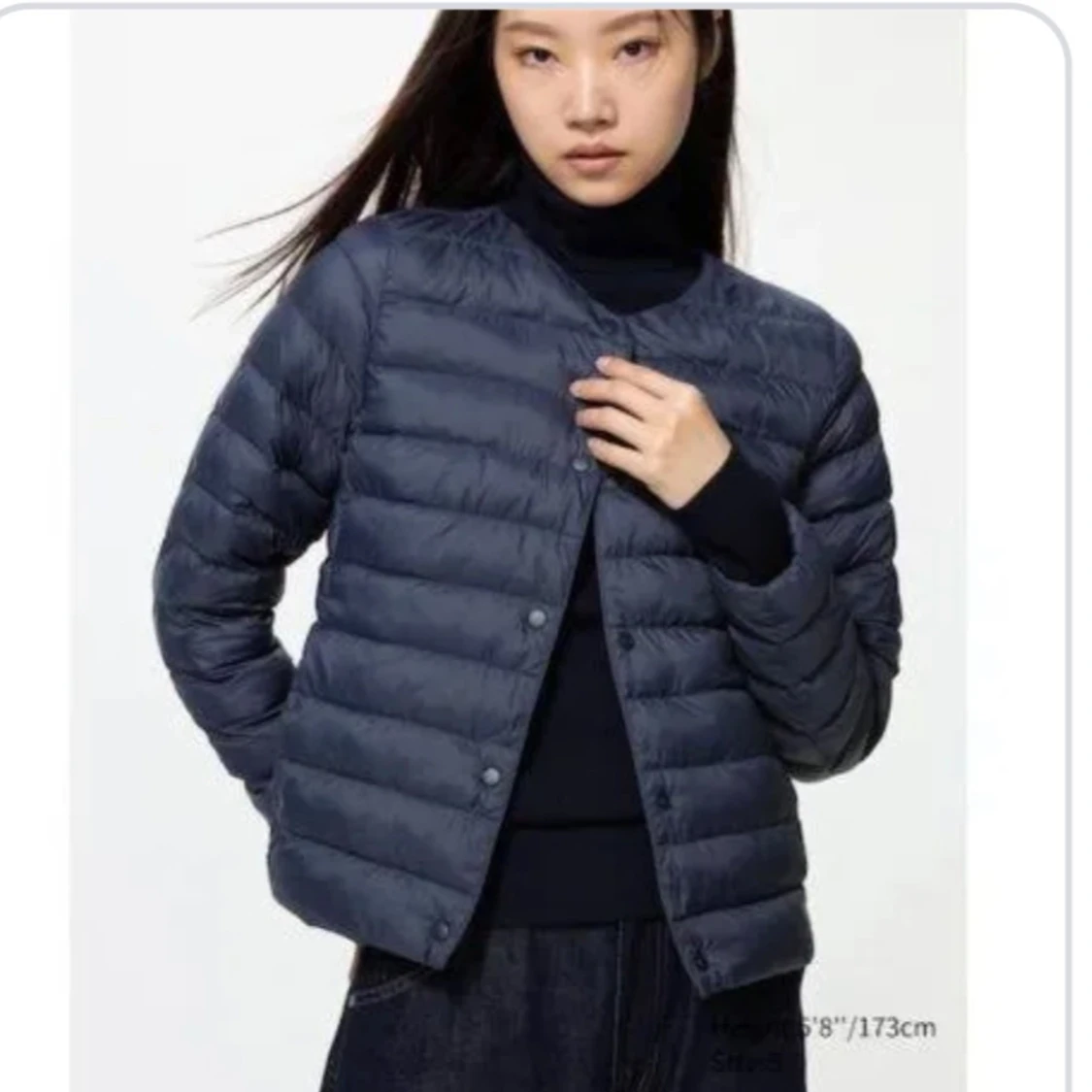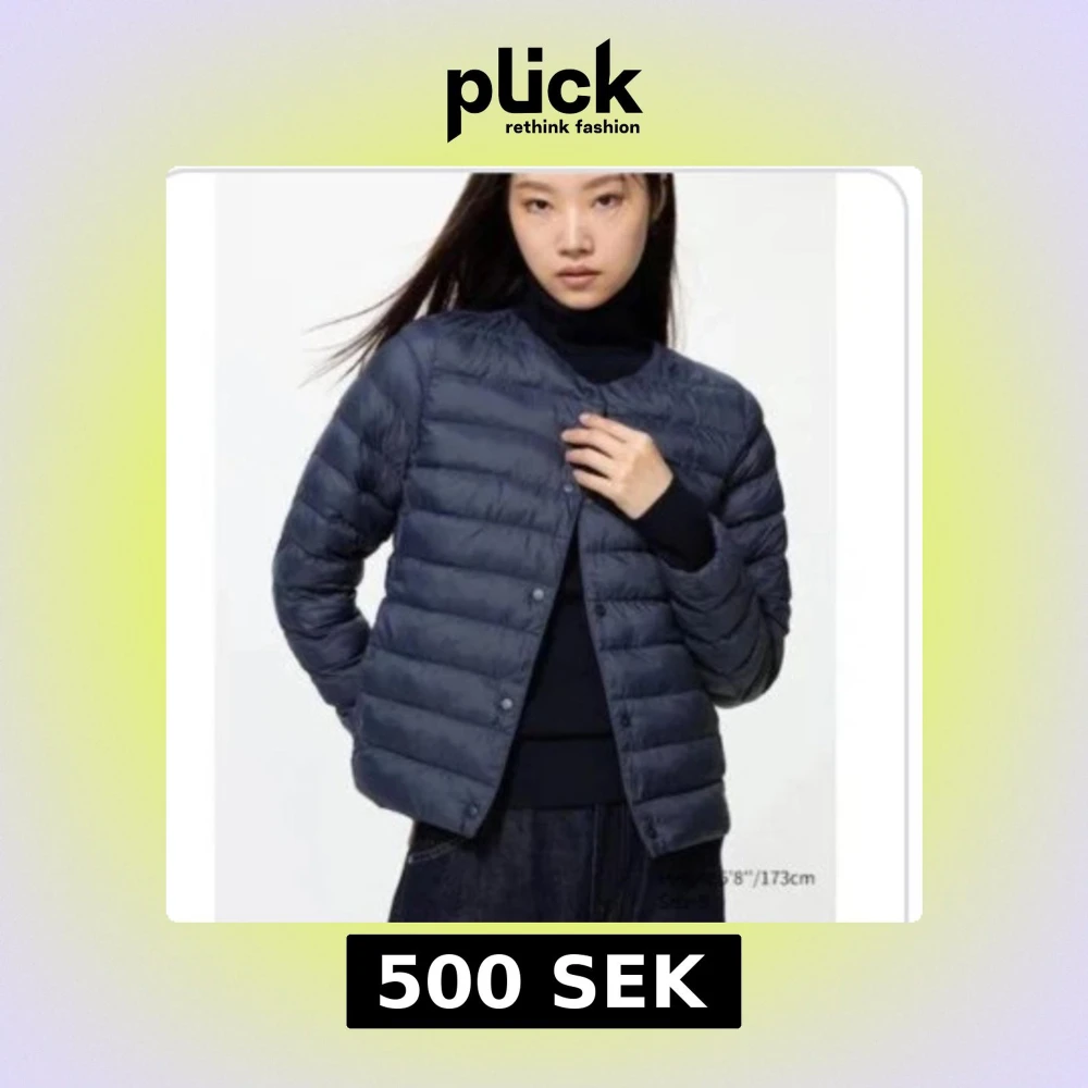 Säljer en stilren mörkblå dunjacka med rund halsringning och tryckknappar framtill. Jackan är quiltad och har en lätt, smidig passform som funkar perfekt till lager-på-lager. Klassisk look utan huva och med långa ärmar.