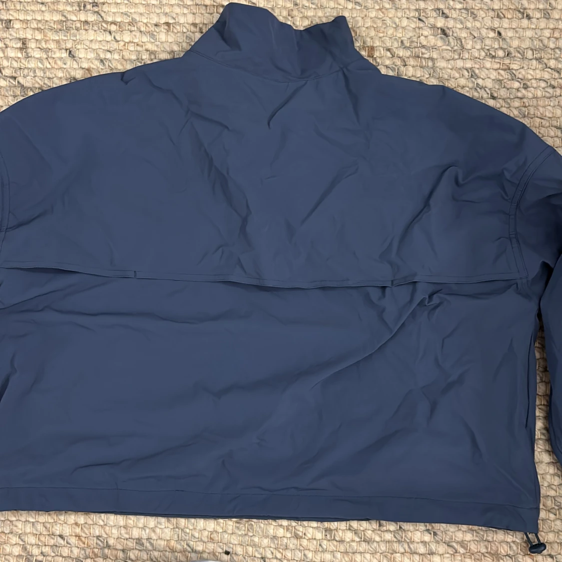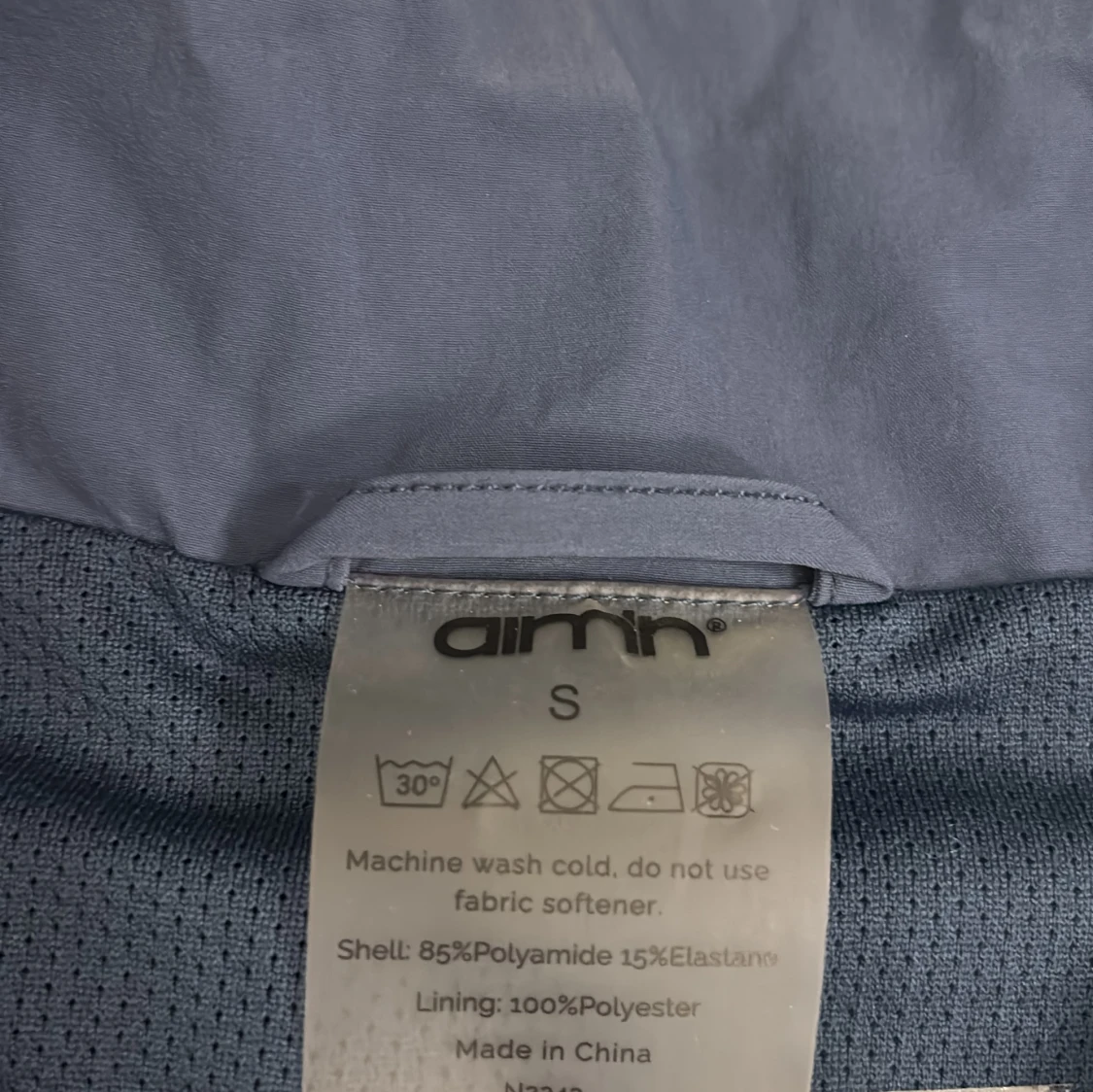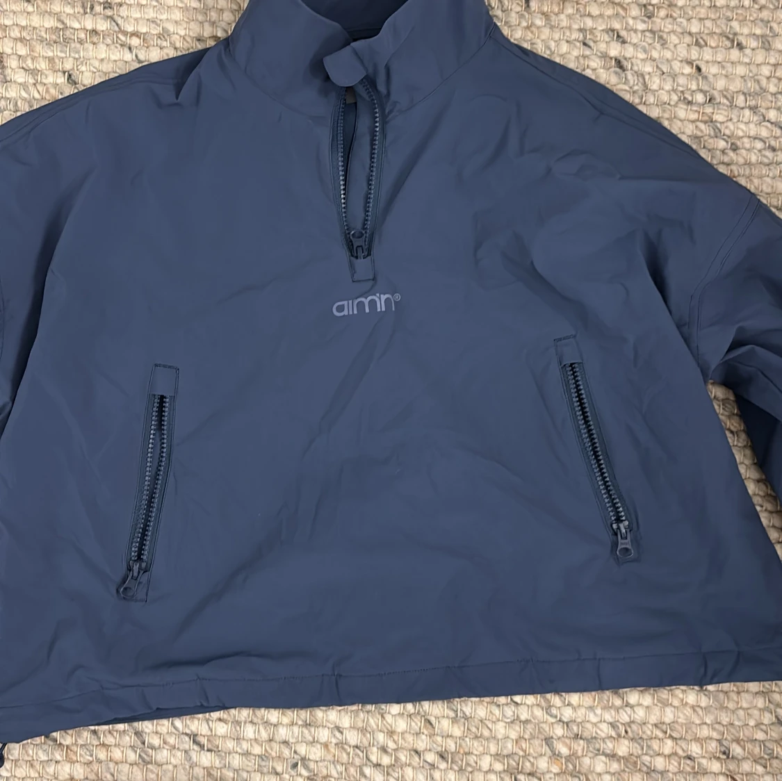 Säljer en mörkblå vindjacka från Aim'n i storlek S. Jackan har en hög krage och dragkedja framtill samt två praktiska fickor med dragkedjor. Materialet är en blandning av polyamid och elastan, vilket gör den både lätt och flexibel.