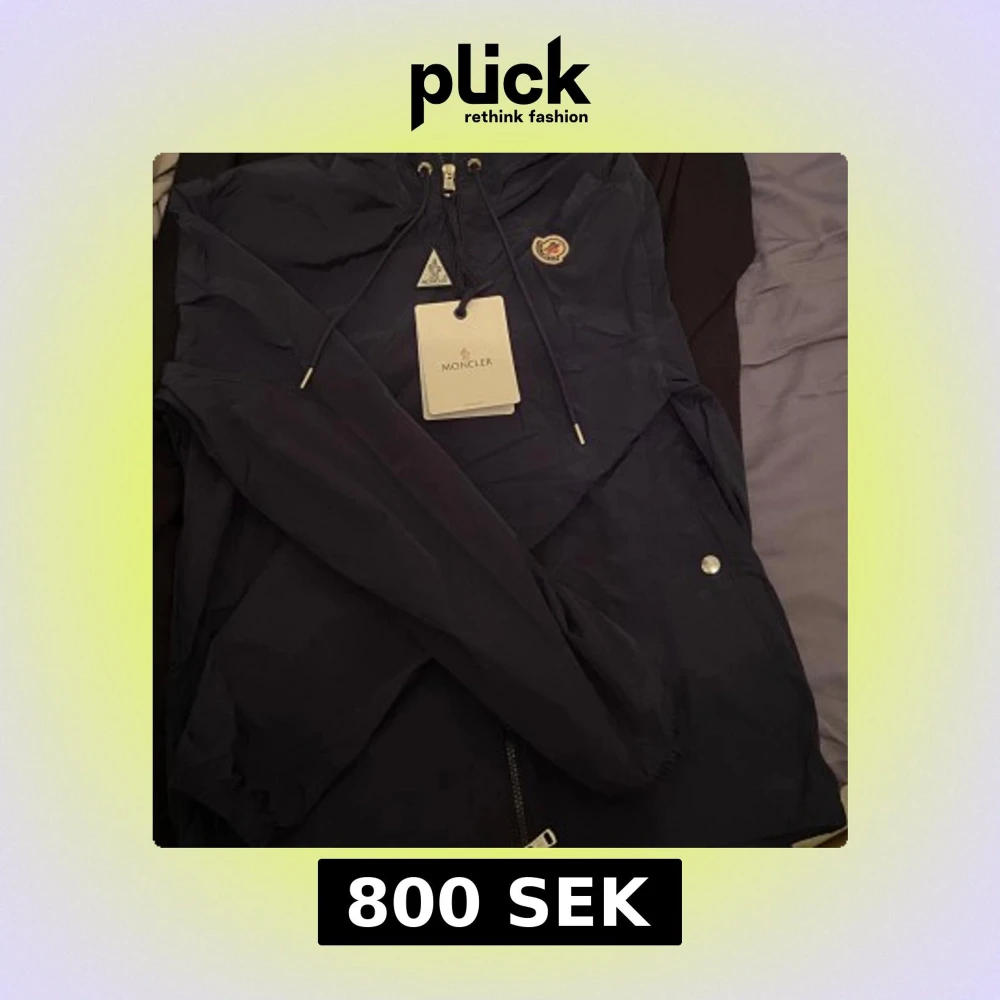 Säljer en snygg mörkblå vindjacka från Moncler med huva och dragkedja. Jackan har en fungerande scan.