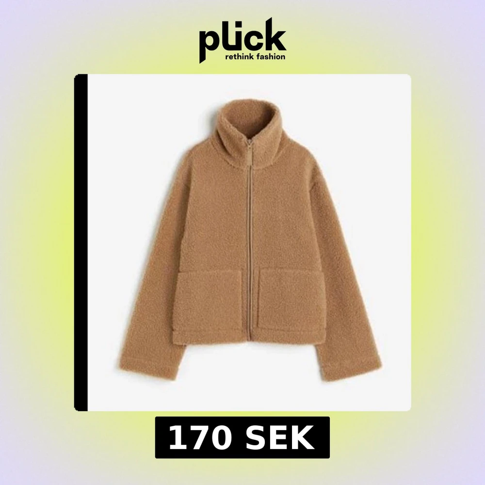 Mysig beige teddyjacka med dragkedja och hög krage. Perfekt för kyliga dagar med sin fluffiga och varma design. Jackan har långa ärmar och två praktiska fickor framtill.